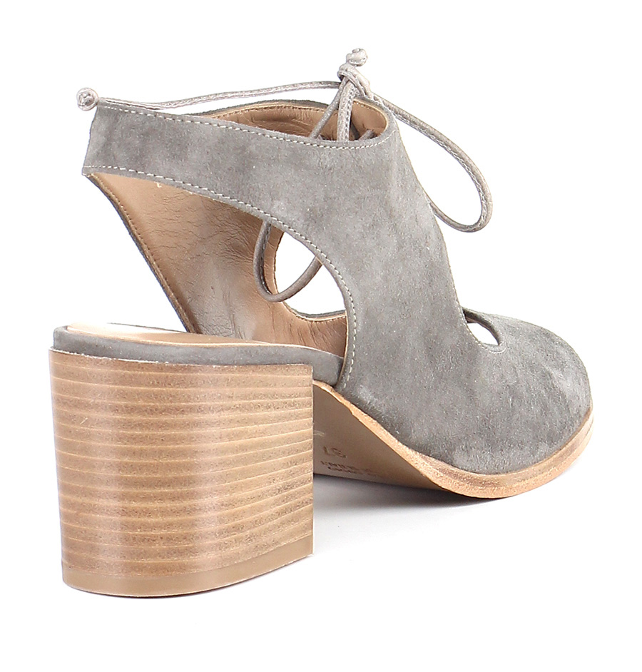 Sandalo alto in camoscio con allacciatura frontale e suola in cuoio. Tacco 70.
