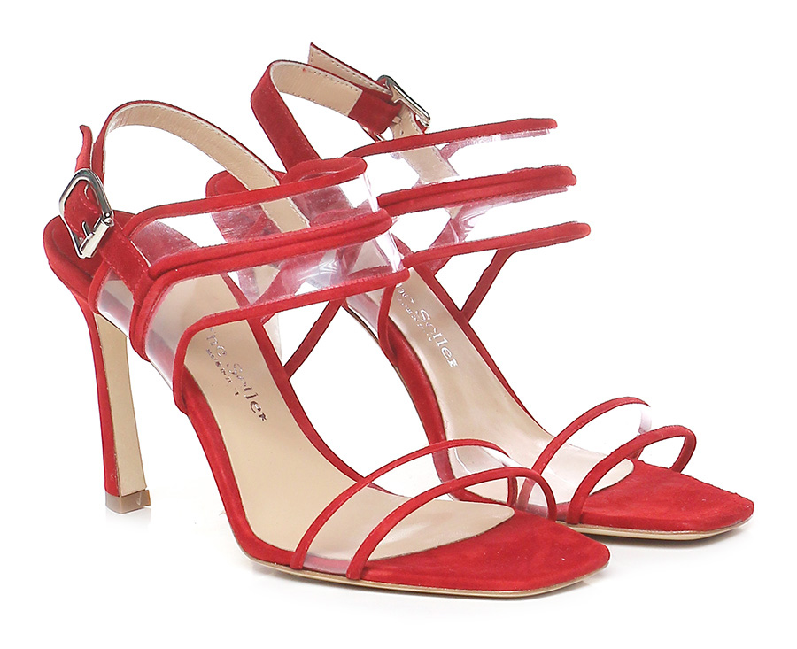 Sandalo alto in camoscio e pvc con cinturino su retro, suola in cuoio. Tacco 100.