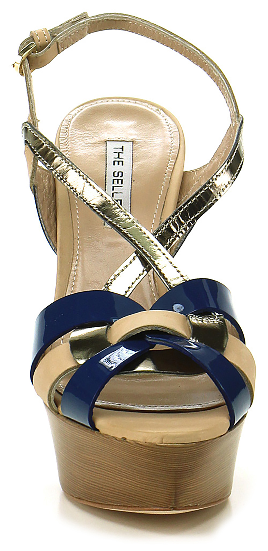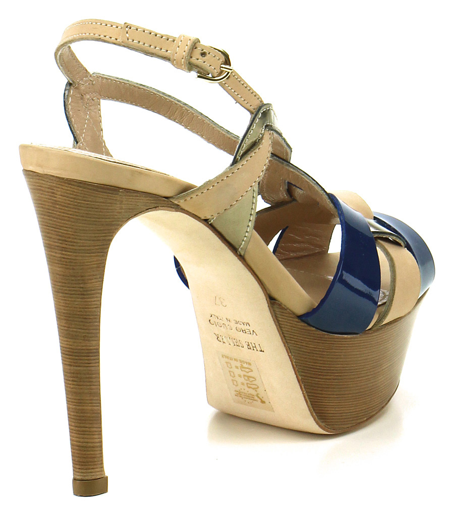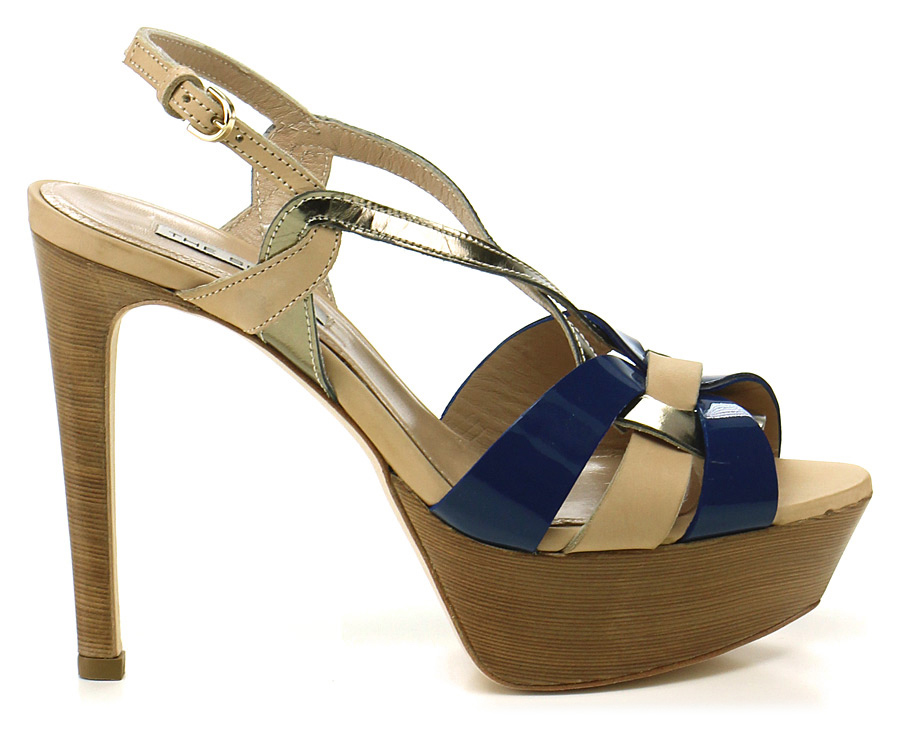Sandalo alto in pelle e vernice con suola in cuoio. Cinturino alla caviglia con fibbia dorata e intrecci frontali in vernice e pelle laminata. Tacco 130, platform 40 con battuta 90. Tacco e platform in legno.