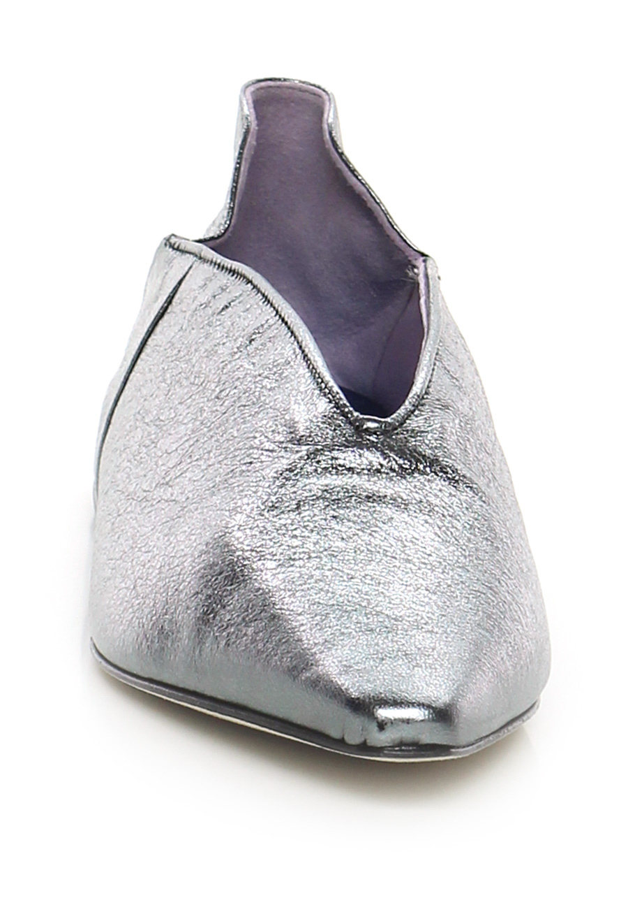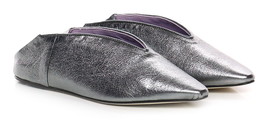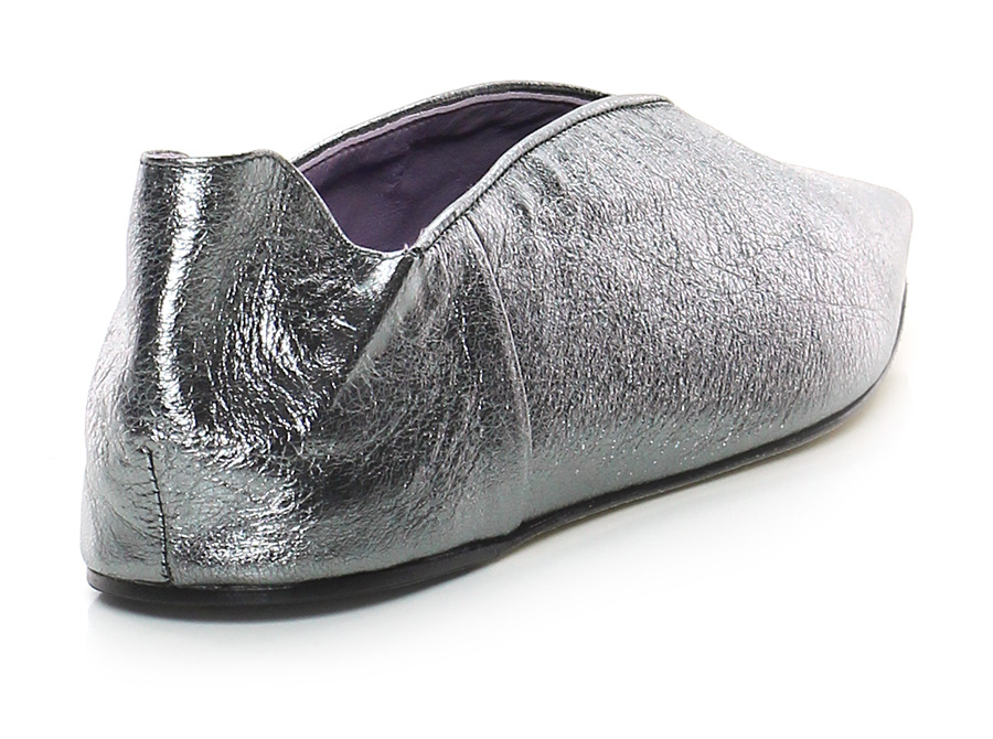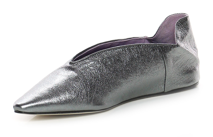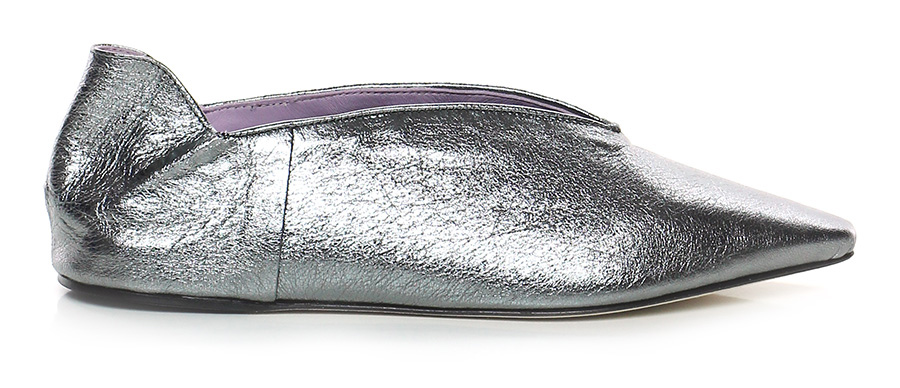 Scarpa bassa in pelle laminata, suola in cuoio. Tacco 20, zeppa interna.