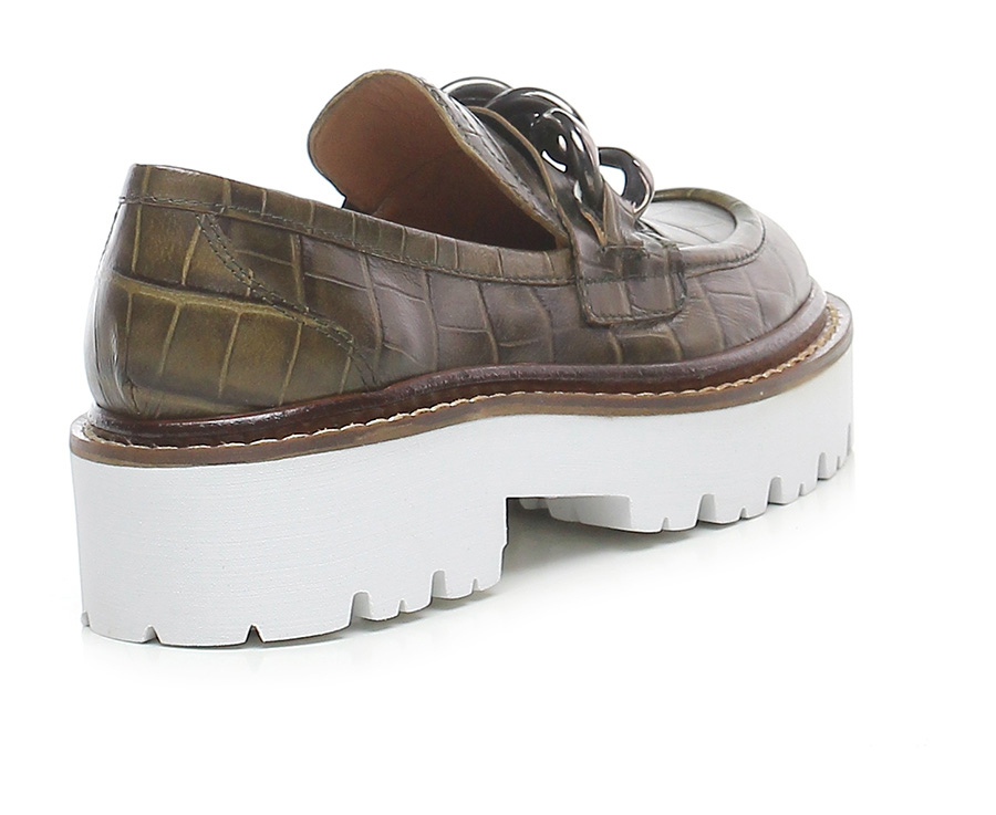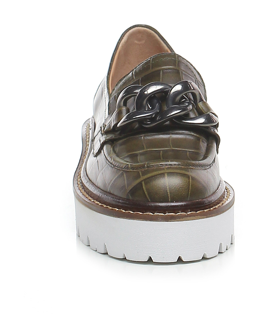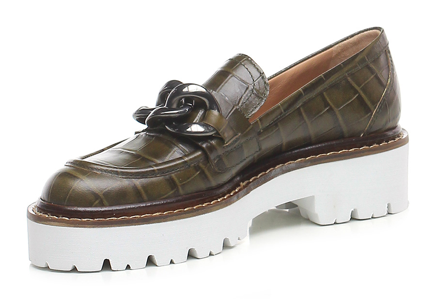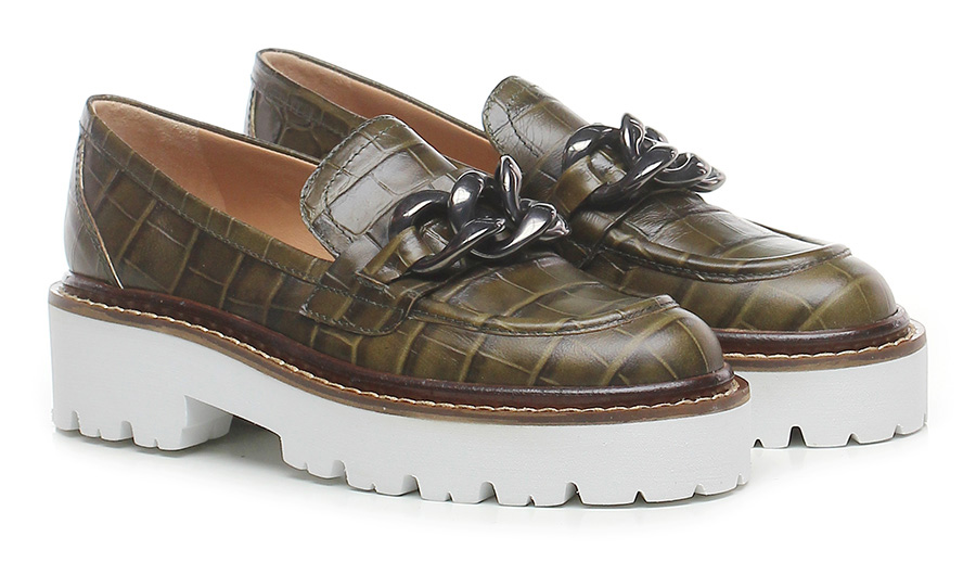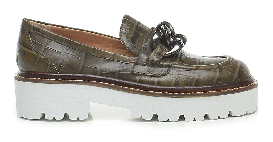 Scarpa bassa in pelle stampa cocco con inserto metallo frontale a catena, suola in gomma light. Tacco 45, platform 30 con battuta 15.