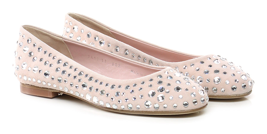 Scarpa bassa in camoscio con applicazioni strass su tomaia. Suola in cuoio Tacco 10.