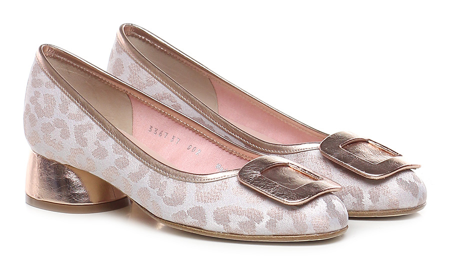 Scarpa bassa in tessuto stampa animalier e pelle laminata, suola in cuoio. Tacco 35, rivestito in pelle laminata.