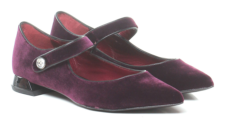 Scarpa bassa in velluto con cinturino frontale e suola in gomma. Tacco 20.