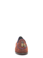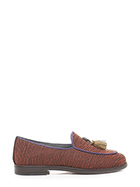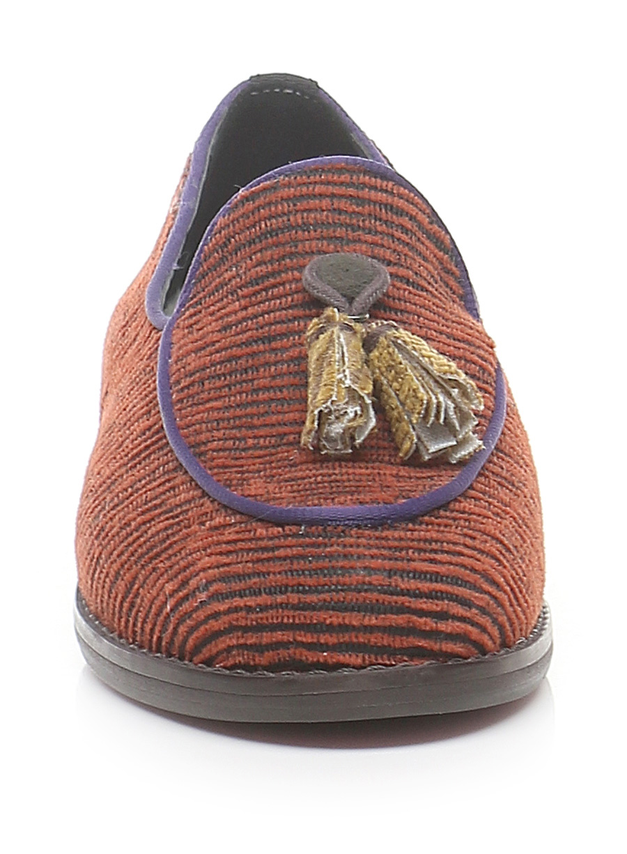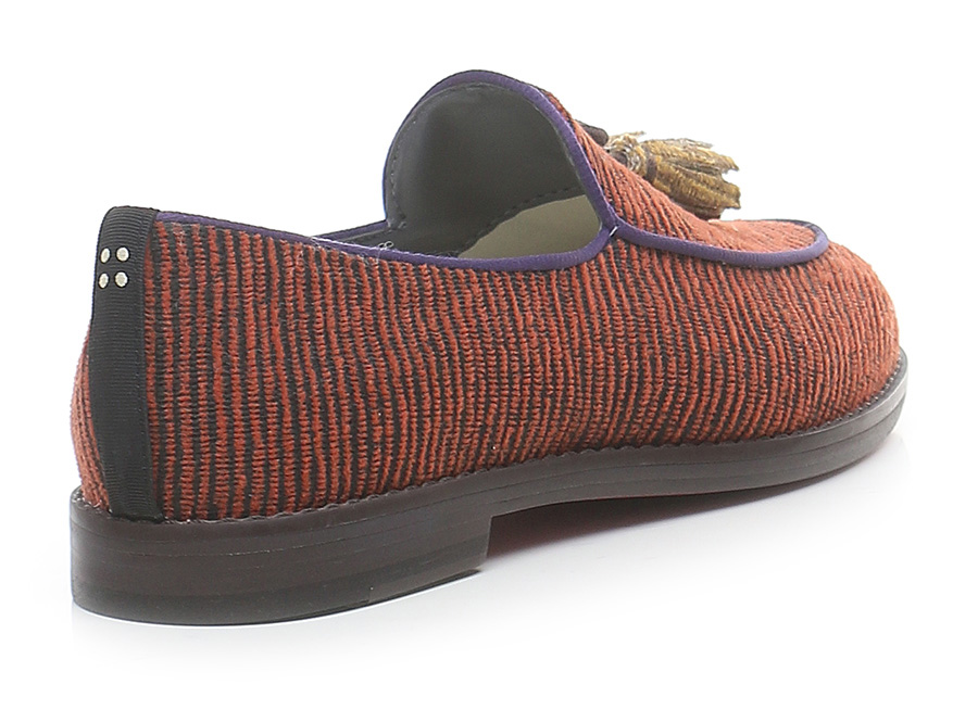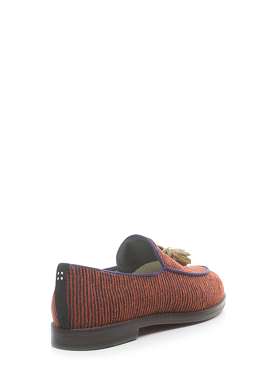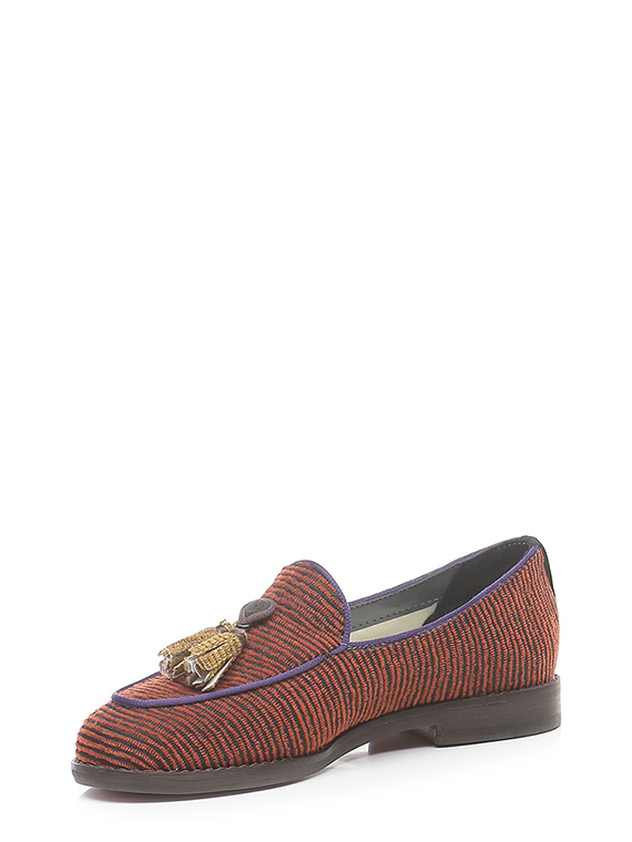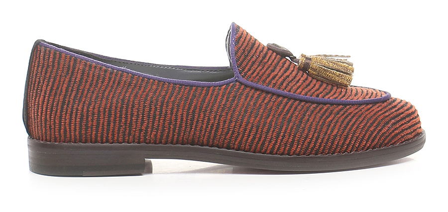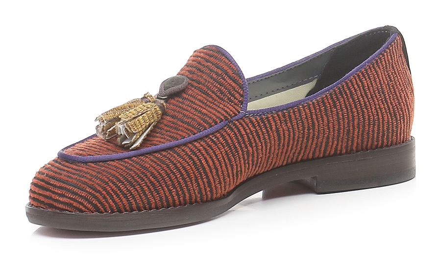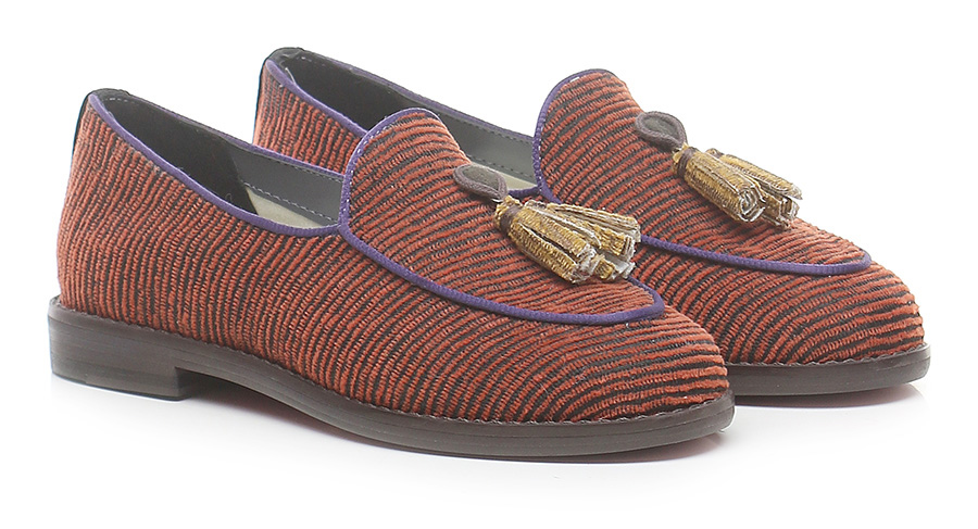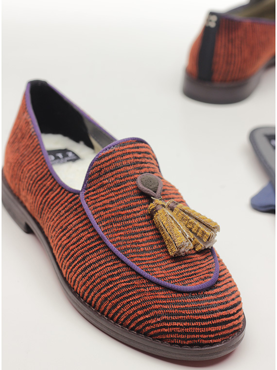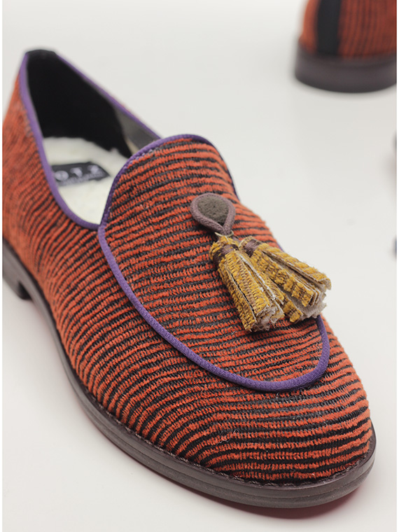 Scarpa in cotone riciclato con nappine frontali e suola in materiale vegano. Altezza tacco 20mm. Soletta interna in montone intercambiabile con altra soletta in tessuto. La scatola, il sacchetto portascarpe interno e dettagli sono prodotti con materiali di scarto domestico riciclati. Fatto a mano in Brasile.