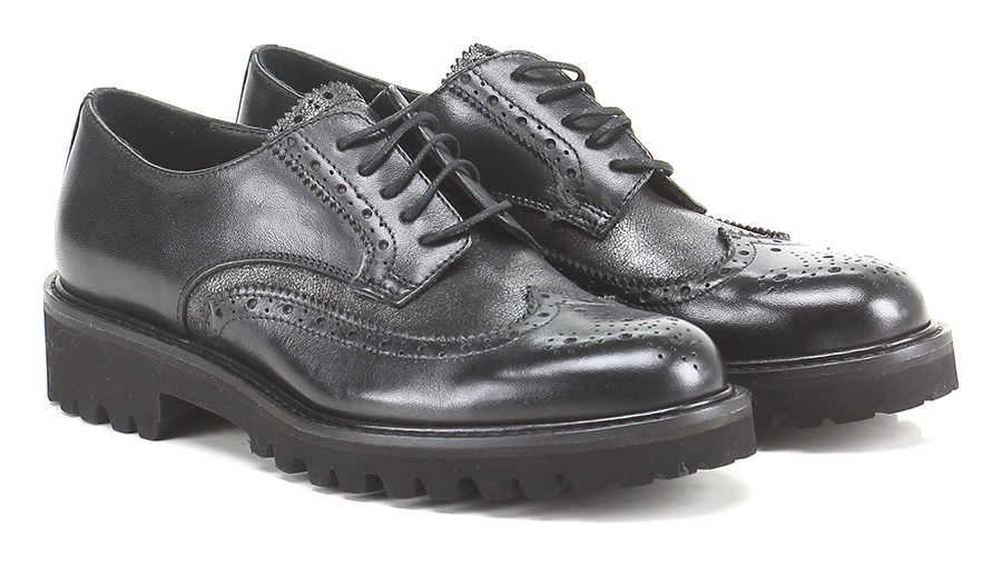 Scarpa bassa in pelle e pelle laminata effetto crack con lavorazione stile inglese e suola in gomma light. Tacco 35, platform 20 con battuta 15.