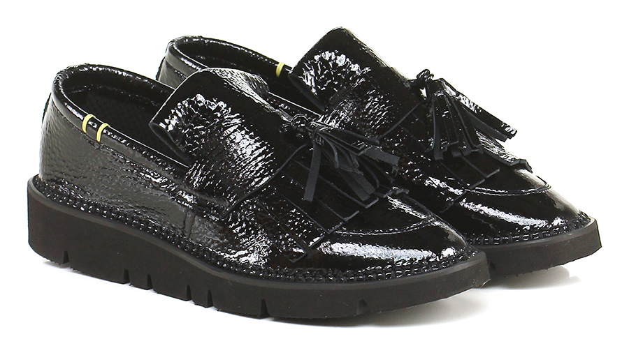 Scarpa bassa in vernice vintage con pattella frontale con frange e nappine. Suola in gomma light, tacco 40, platform 25 con battuta 15.
