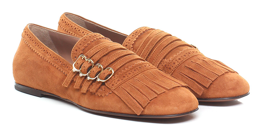 Scarpa bassa in camoscio con multi cinturino frontale e frange frontali. Suola in cuoio e gomma.
