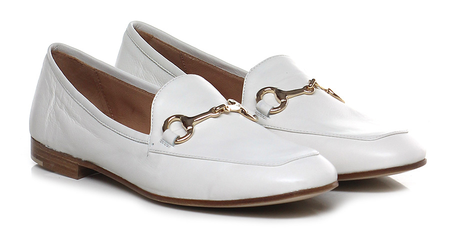 Scarpa bassa in pelle con inserto metallico frontale e suola in cuoio e gomma. Tacco 15.