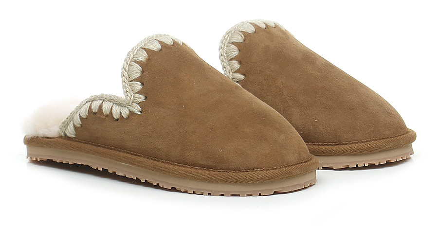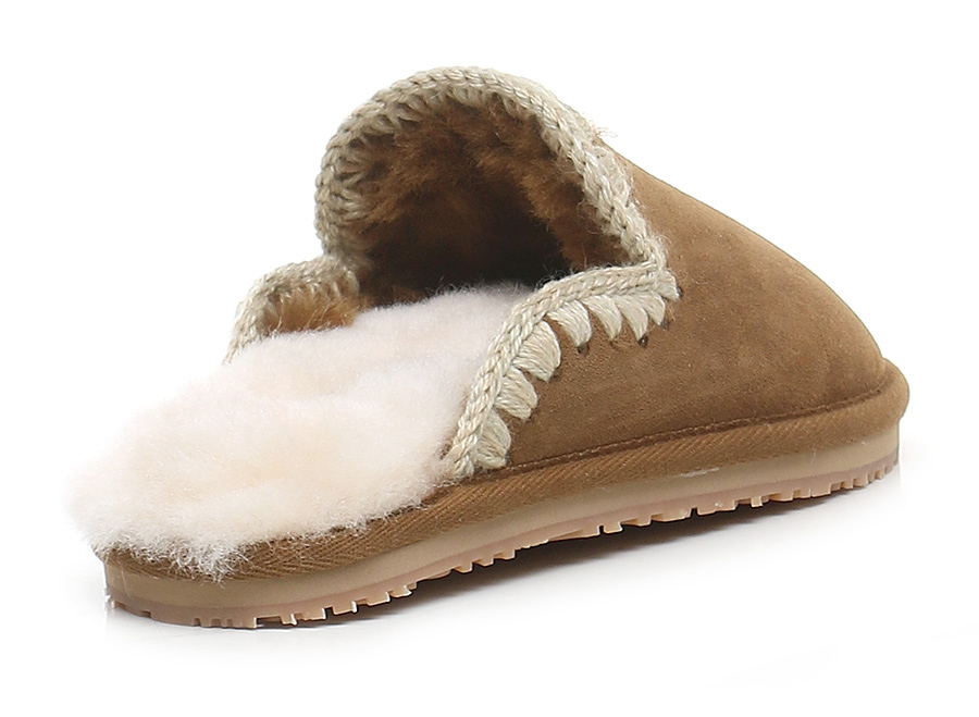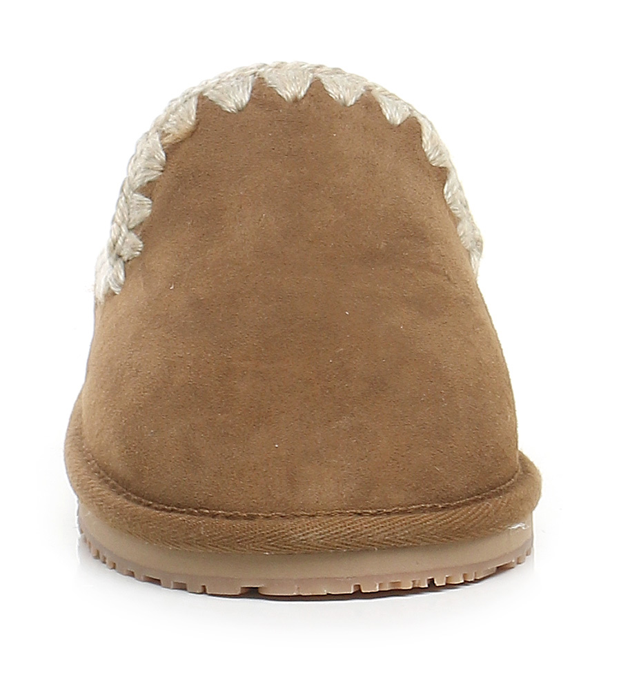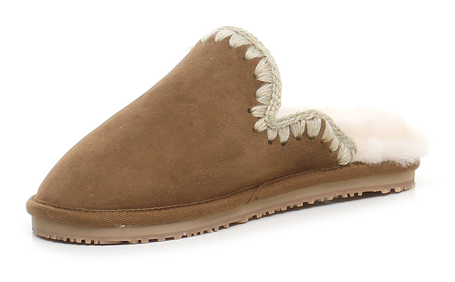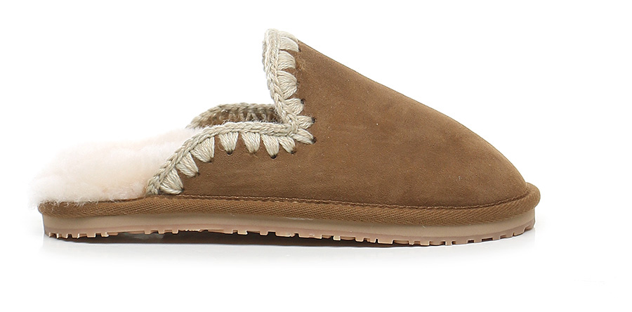 Scarpa in camoscio e tessuto, foderata in montone. Suola in gomma: altezza tacco 20mm, platform 15mm con battuta di 5mm.