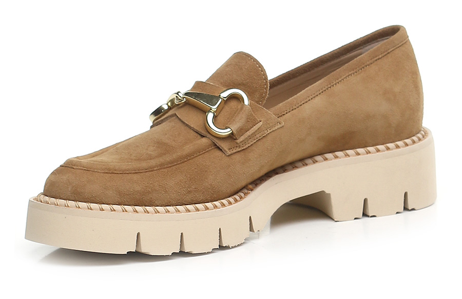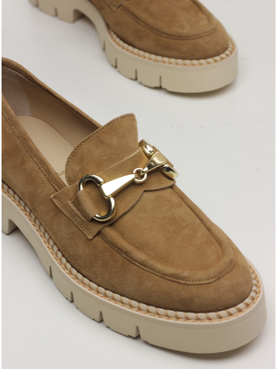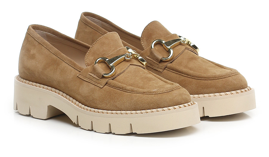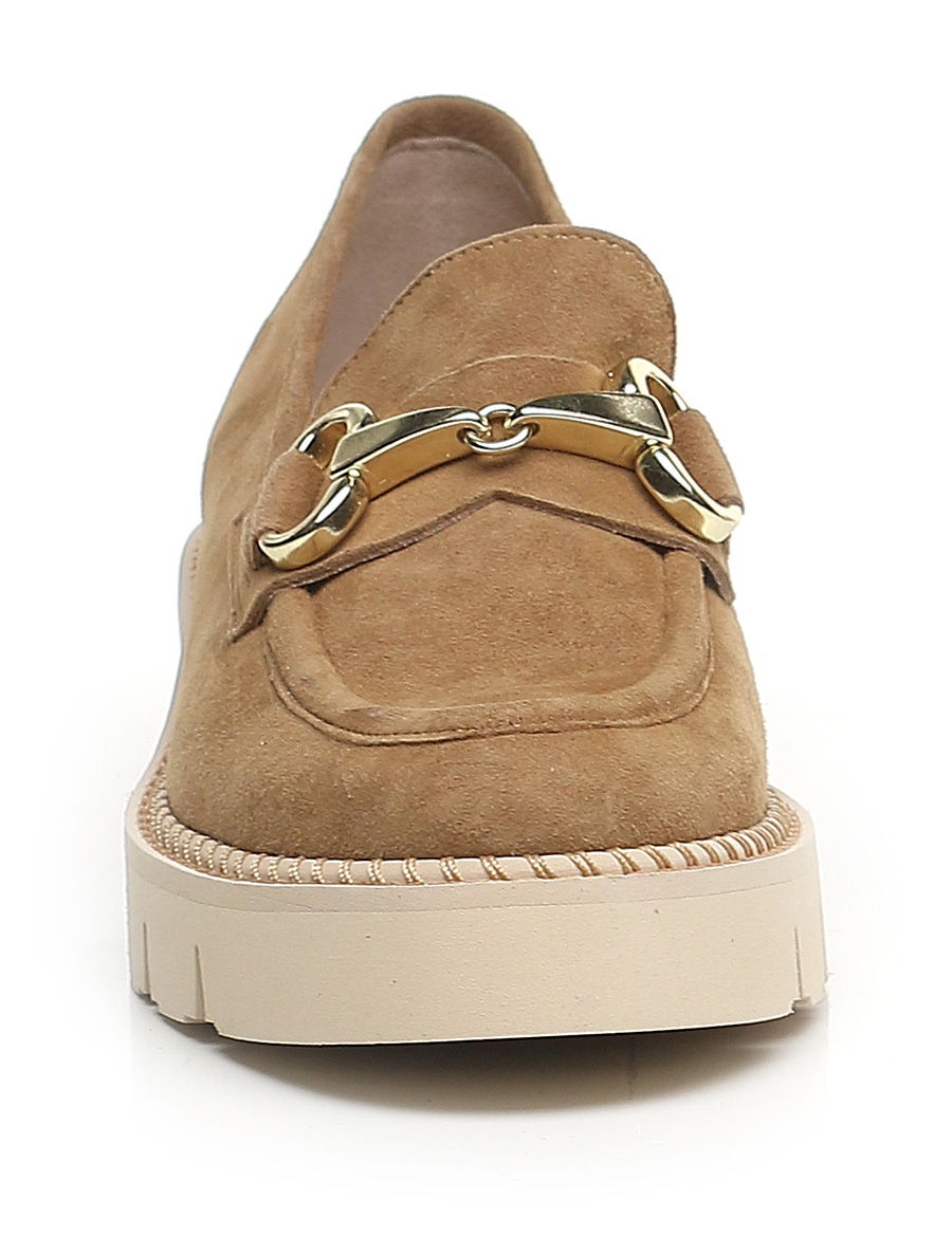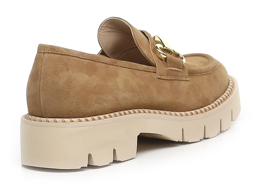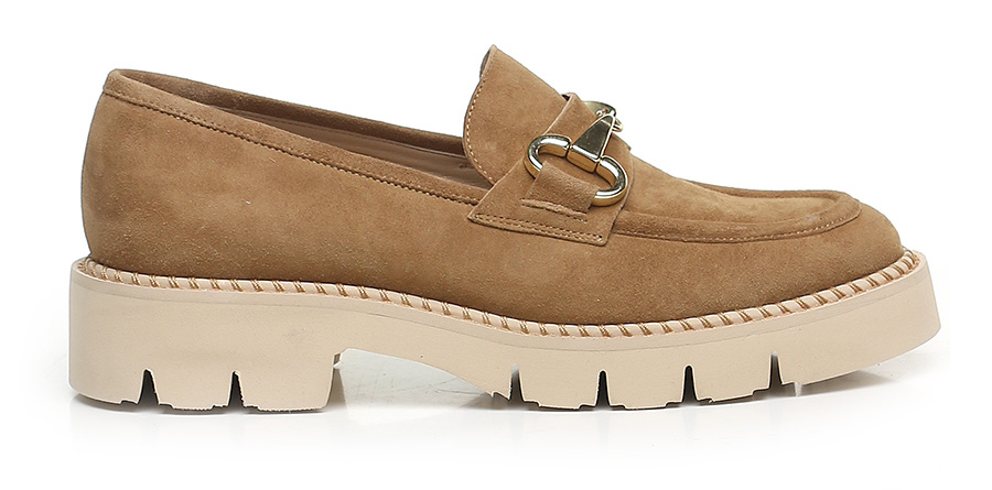 Scarpa in camoscio con morsetto frontale. Suola in gomma. Altezza tacco 40mm, platform 25 con battuta 15mm.
