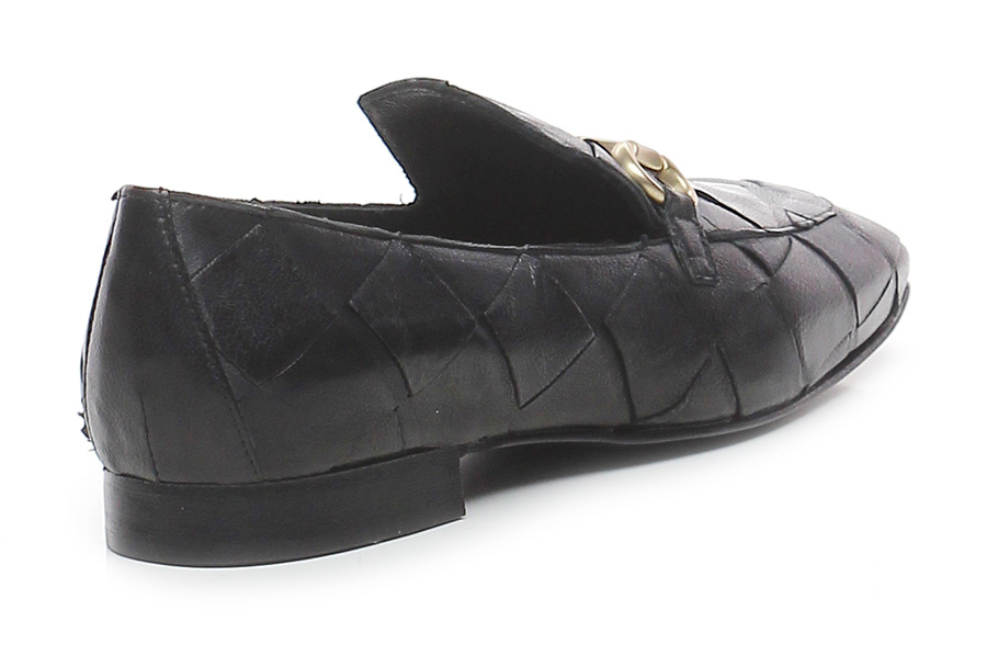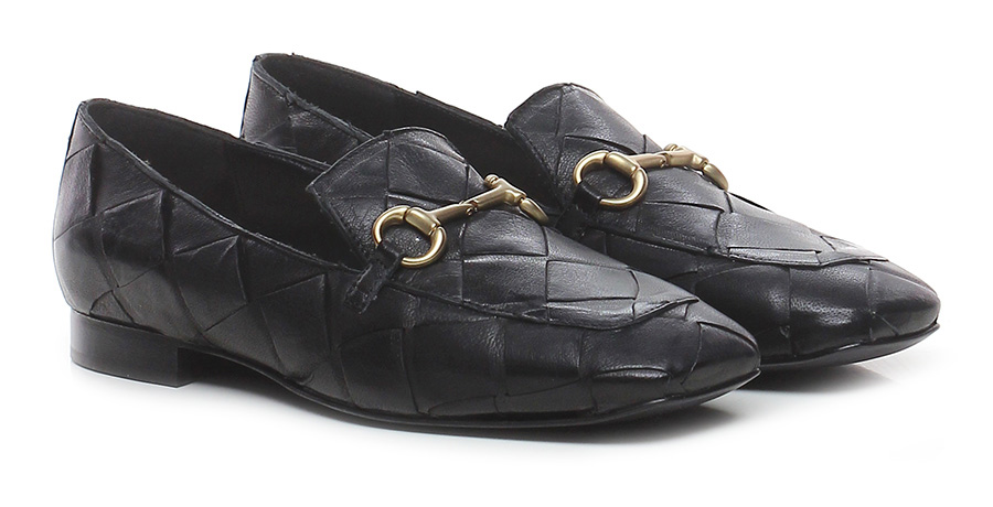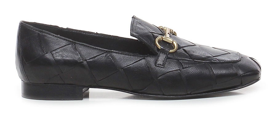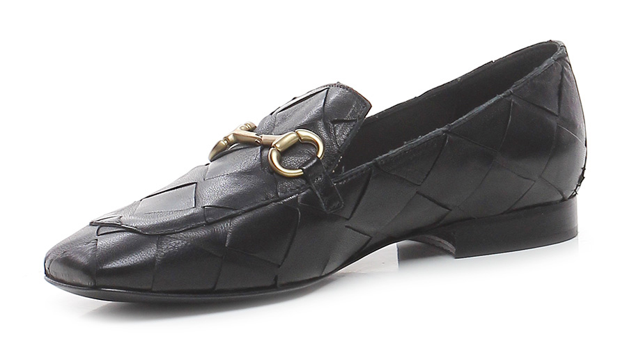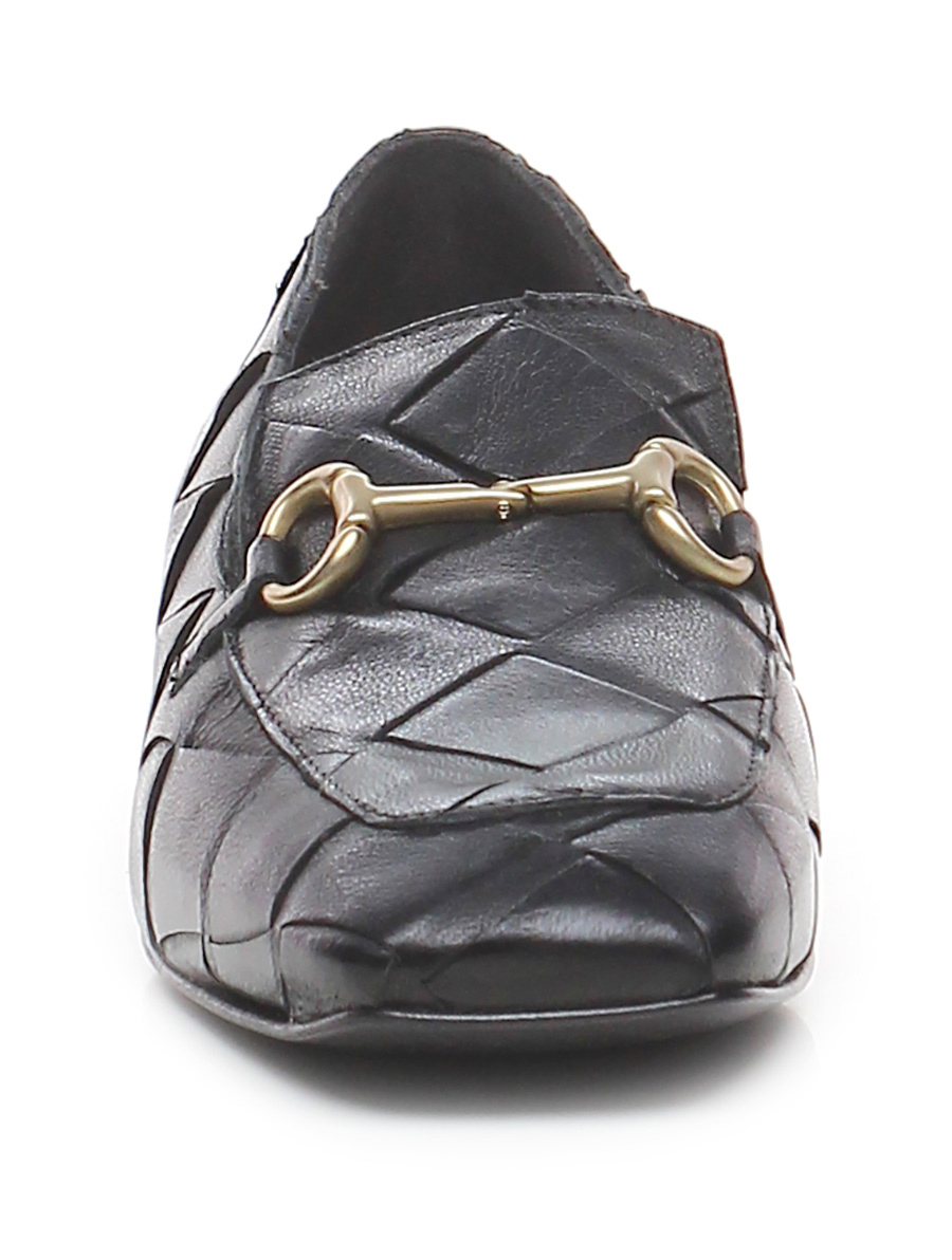 Scarpa bassa stile mocassino in pelle intrecciata con morsetto metallico frontale, suola in cuoio. Tacco 15. Punta quadrata.