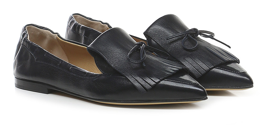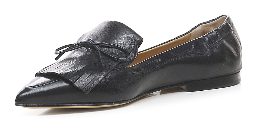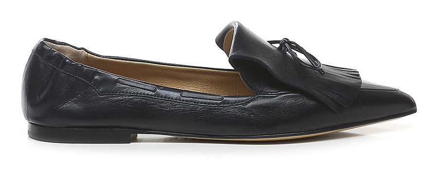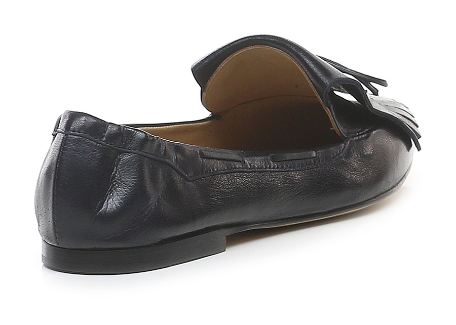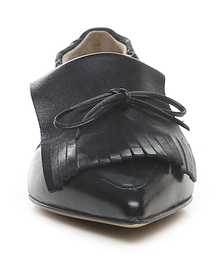 Scarpa in pelle con patella frontale con frange. Suola in cuoio e gomma