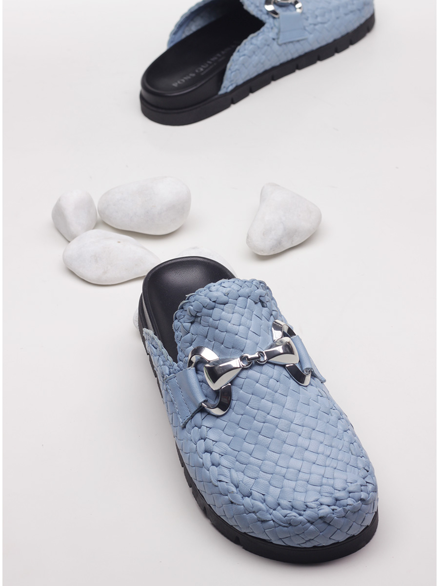 Scarpa in pelle intrecciata con morsetto metallico frontale. Suola in gomma. Altezza tacco 25mm, platform 20mm con battuta 5mm.