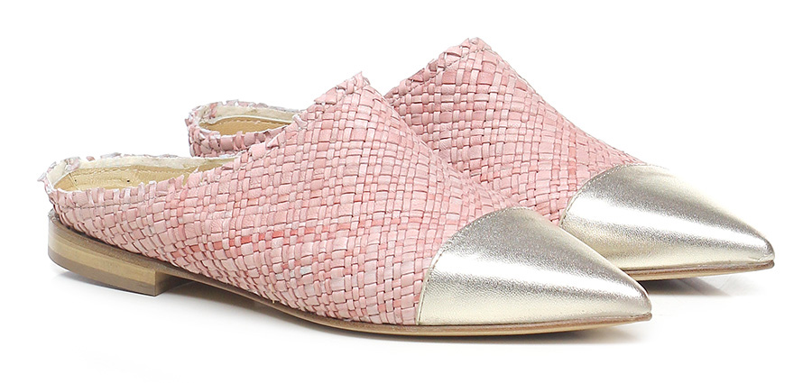 Scarpa bassa in pelle intrecciata e pelle laminata, suola in cuoio e gomma. Tacco 15.