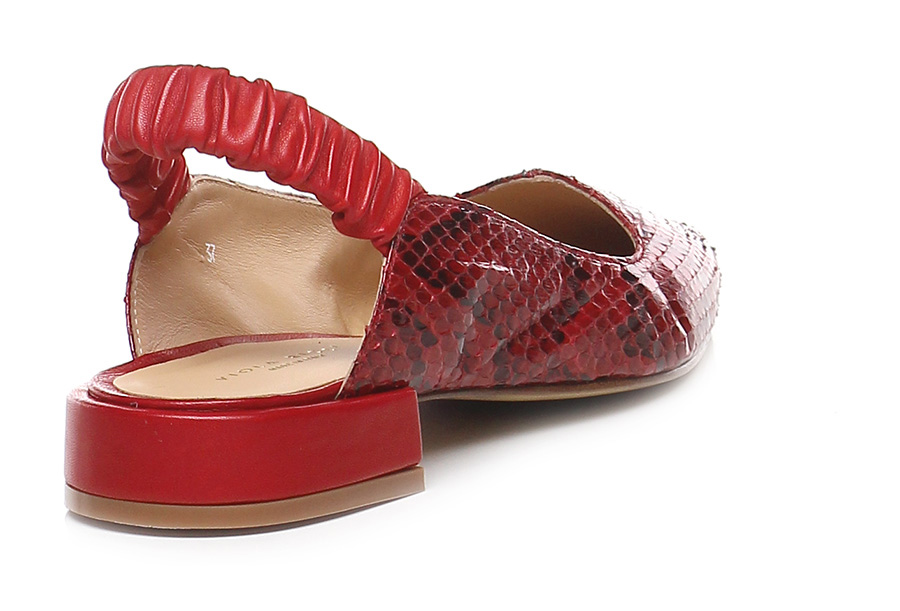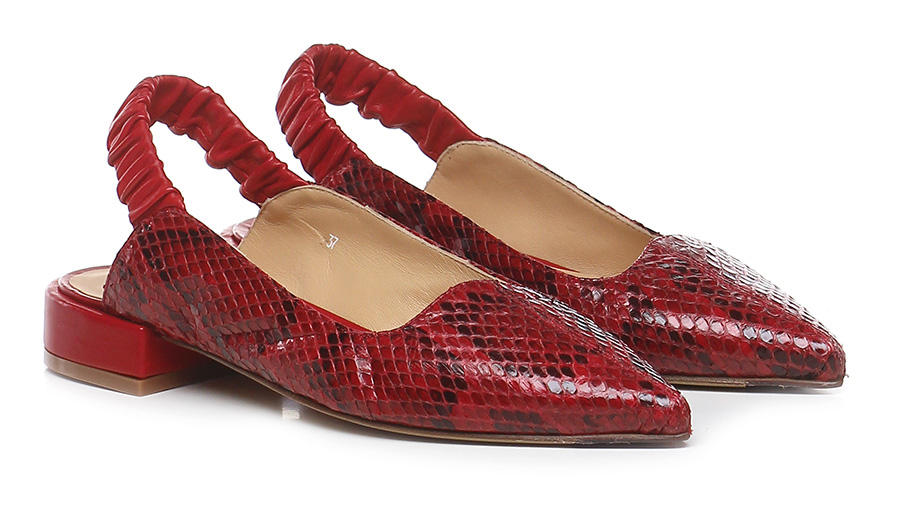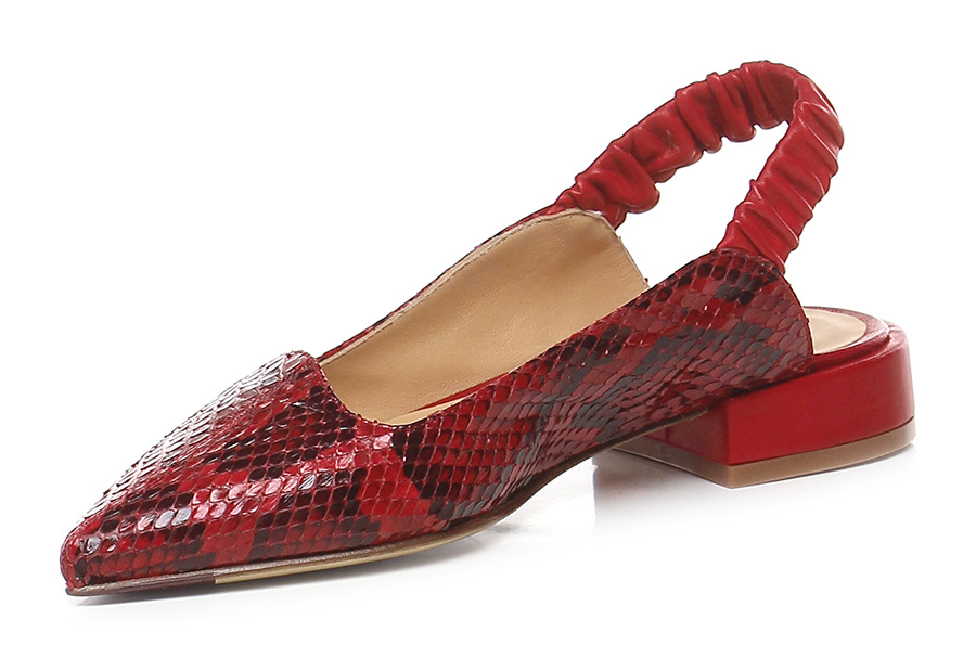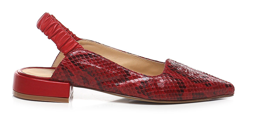 Scarpa bassa in pelle stampa pitone con cinturino sul retro elasticizzato, suola in cuoio e gomma. Tacco 25, rivestito in pelle.