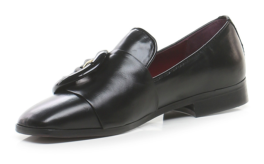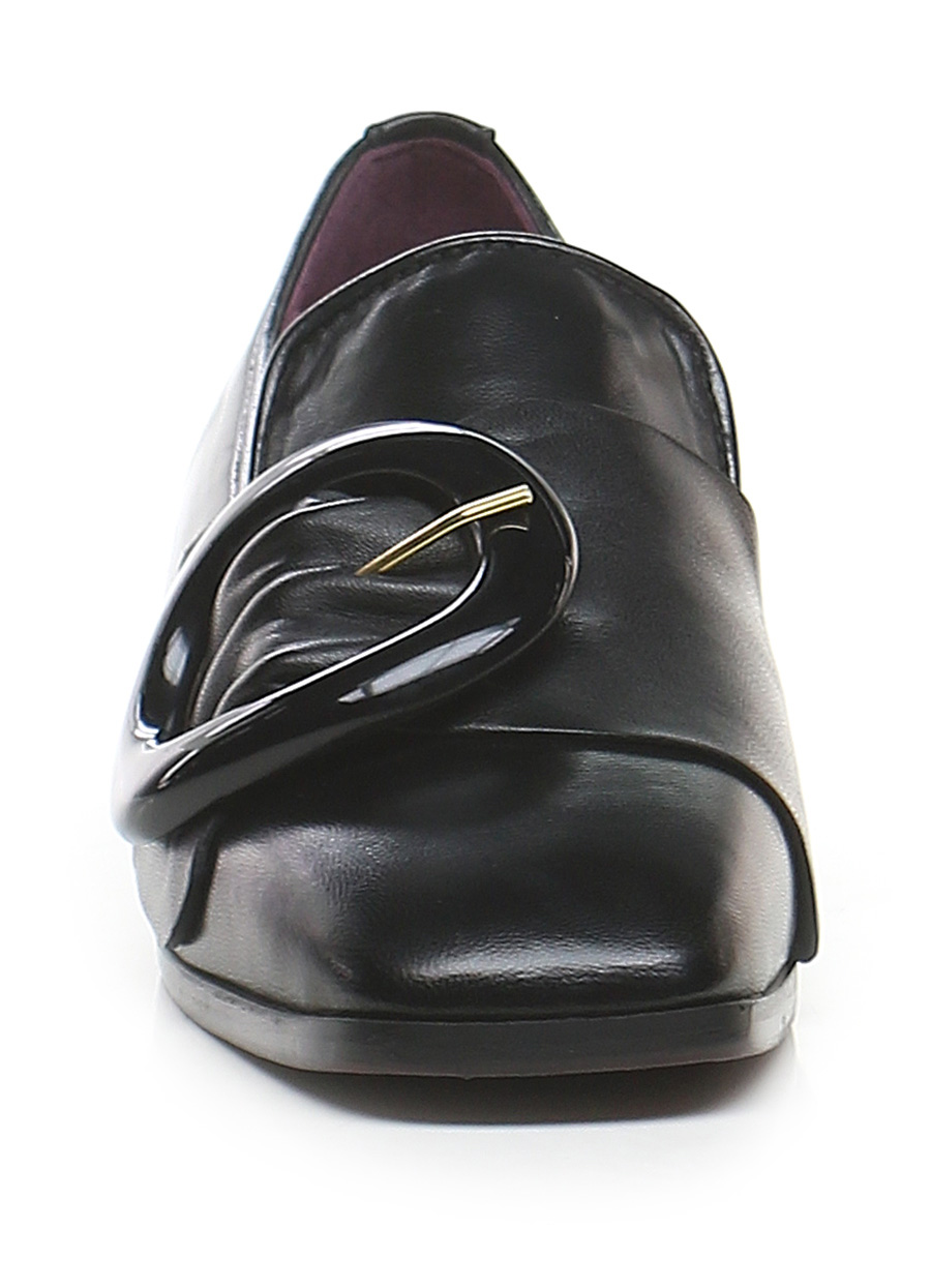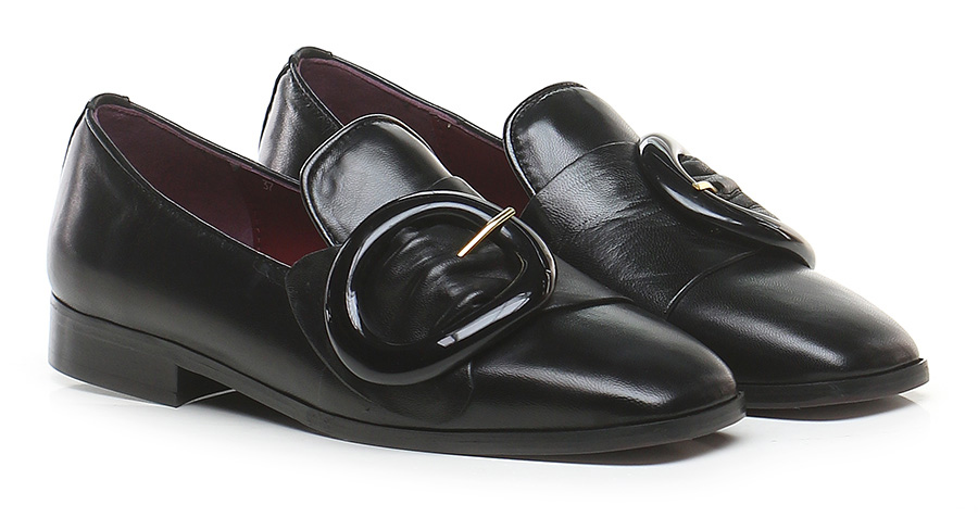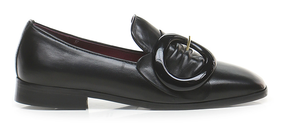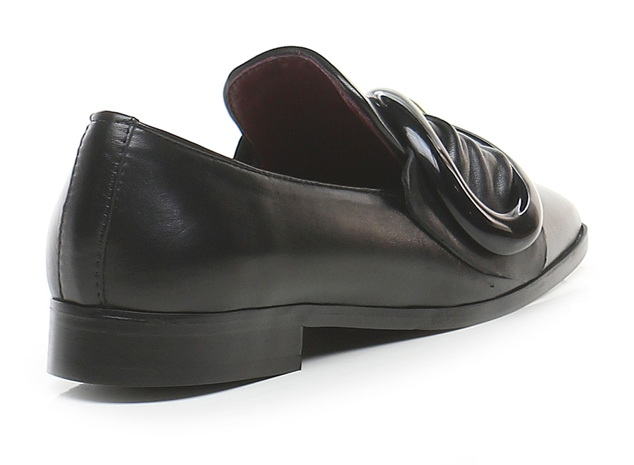 Scarpa in pelle con accessiorio frontale. Suola in gomma. Altezza tacco 20mm.