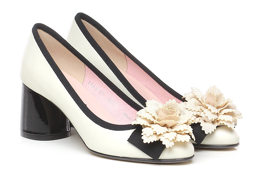 Scarpa con tacco in pelle con fiore in tessuto frontale, suola in cuoio. Tacco 65, foderato in vernice.
