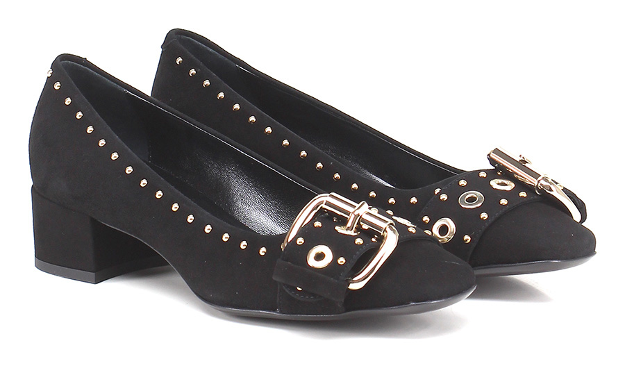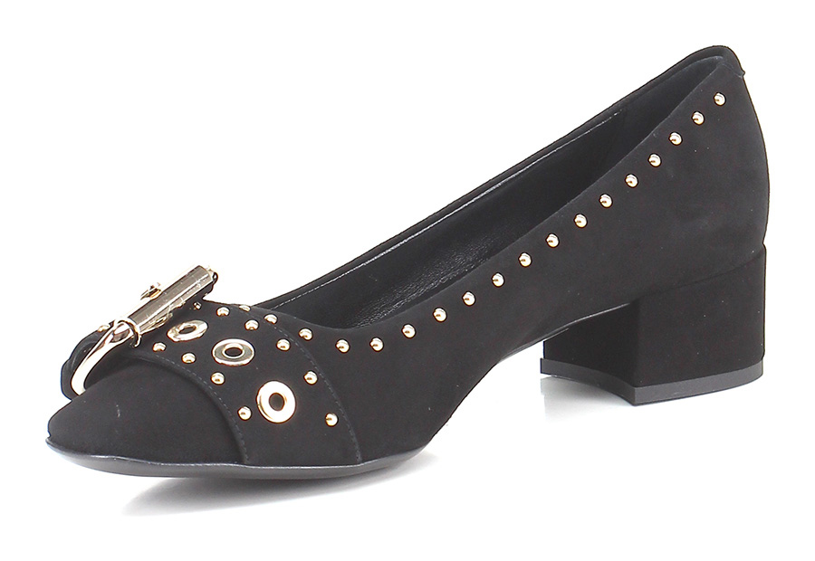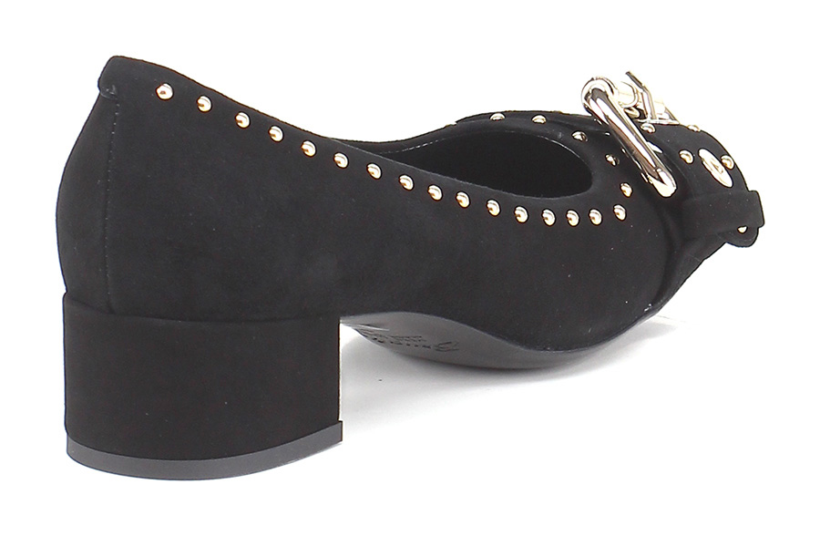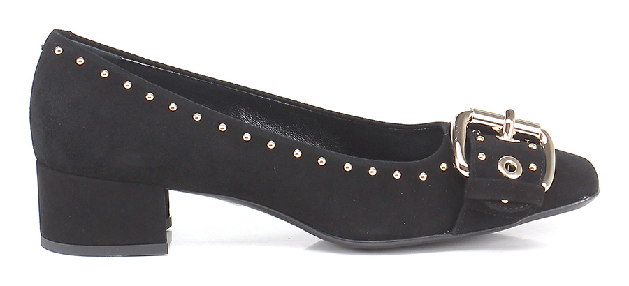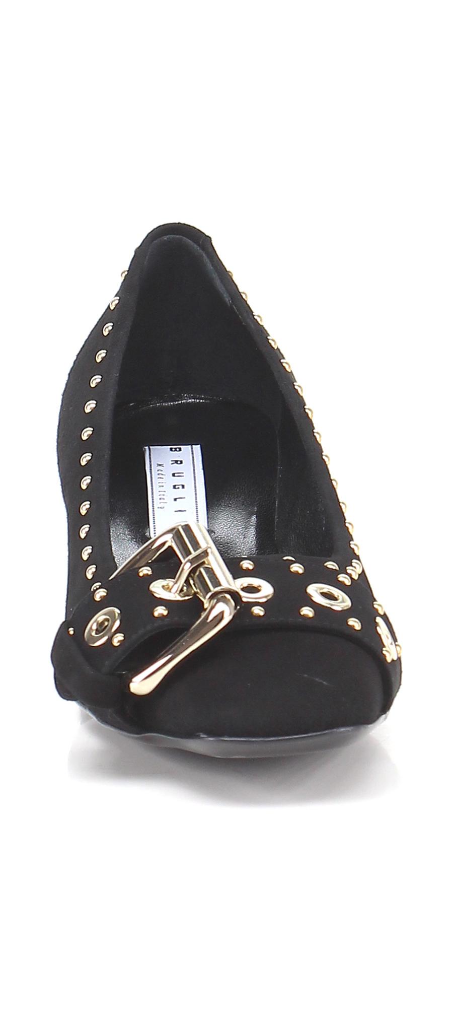 Scarpa con tacco in camoscio con borchie su tomaia e cinturino frontale. Suola in cuoio e gomma, tacco 40.