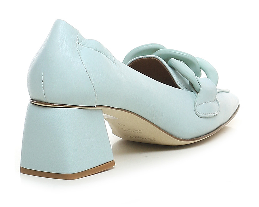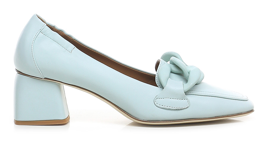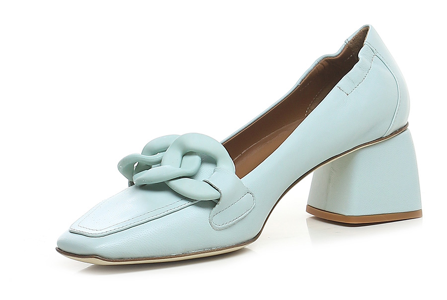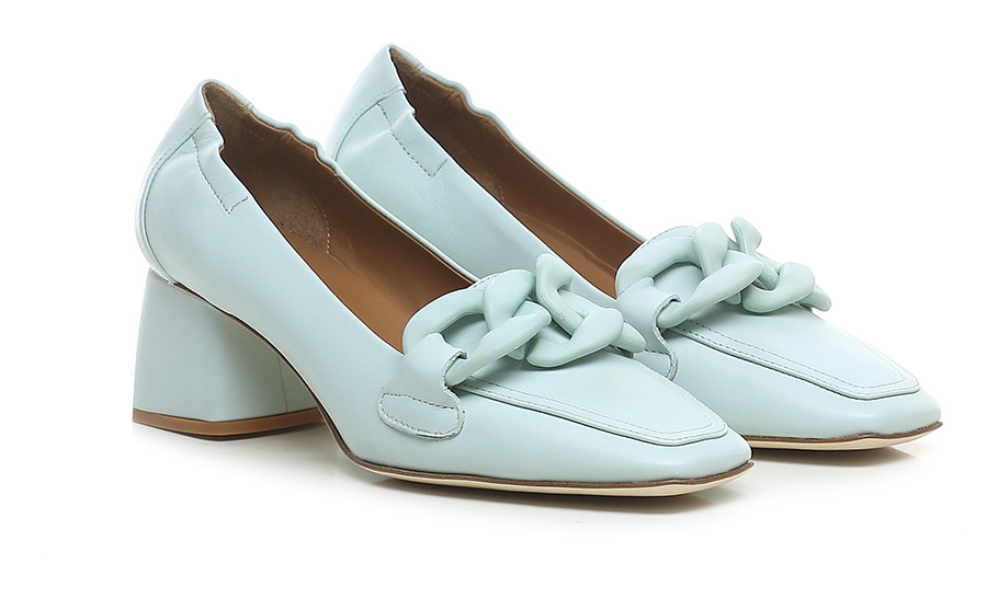 Scarpa in pelle con accessorio in pvc a catena. Suola in cuoio e gomma. Altezza tacco 55mm.