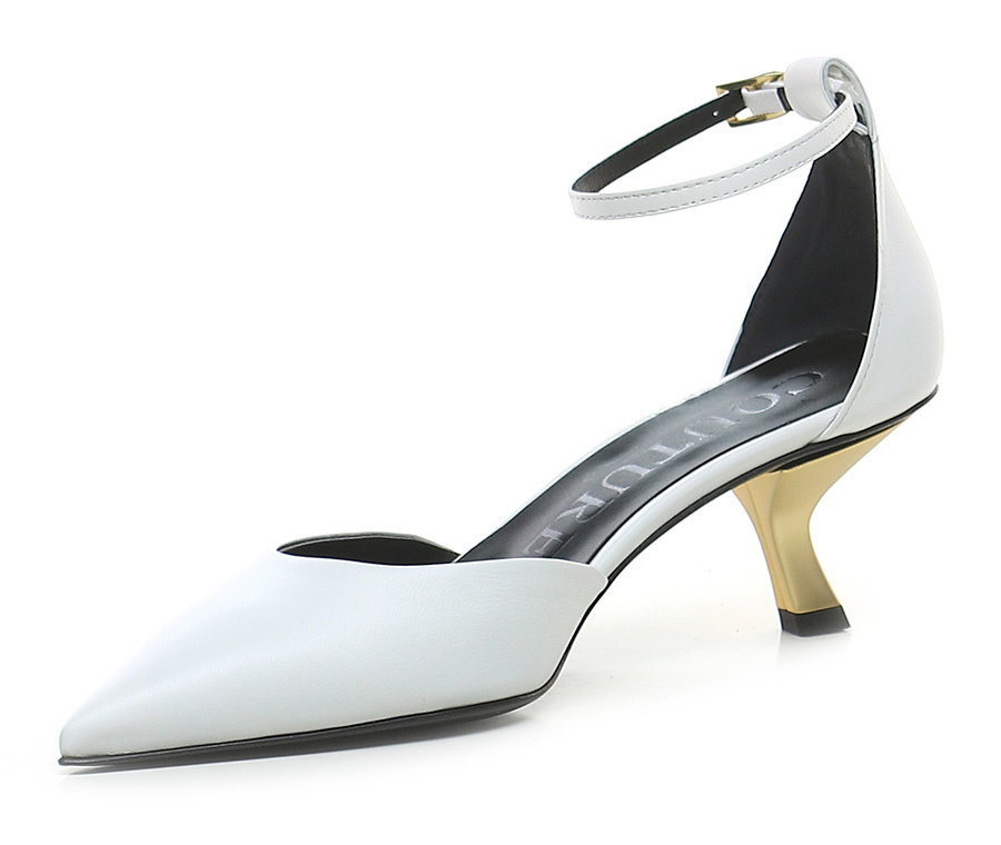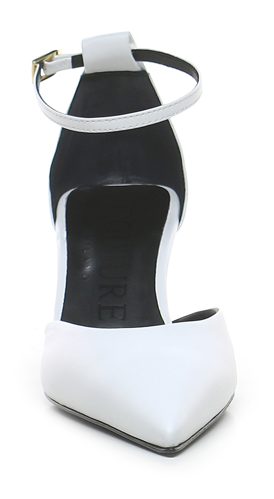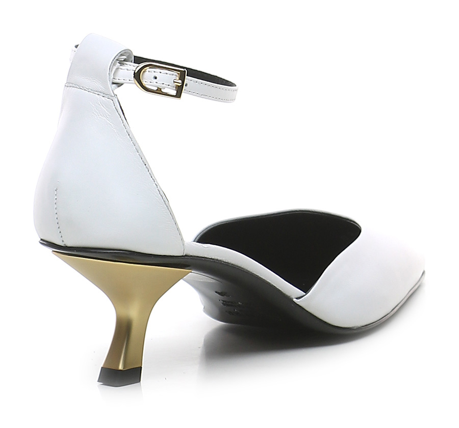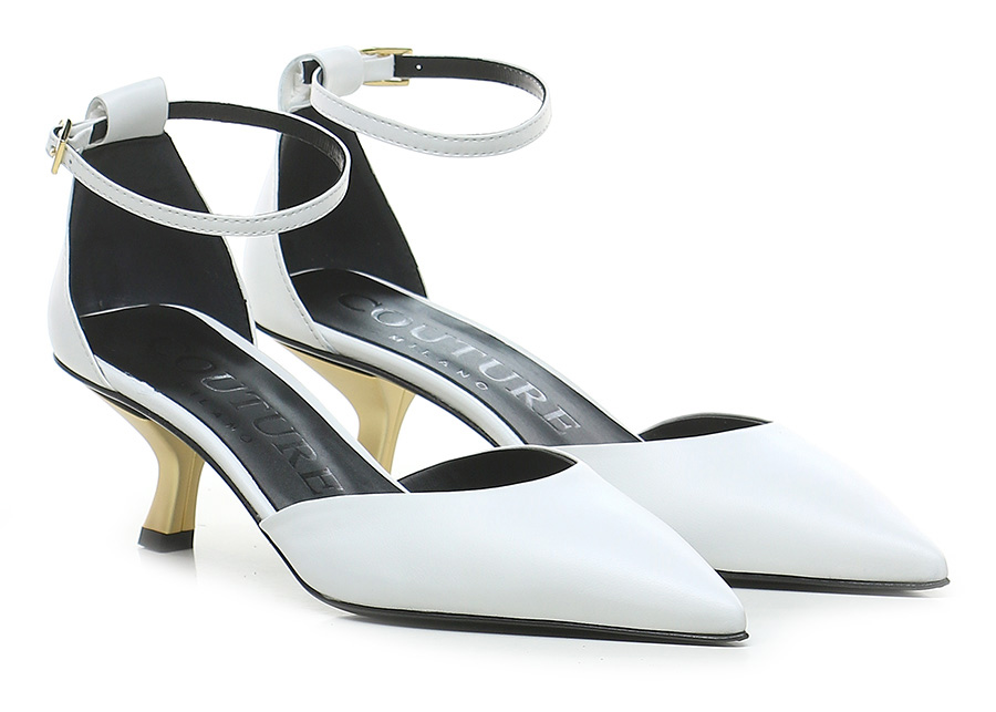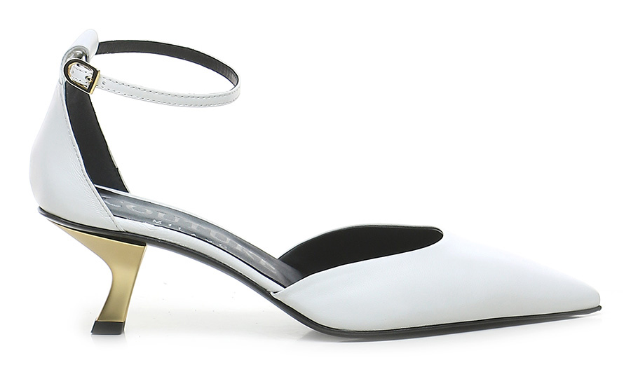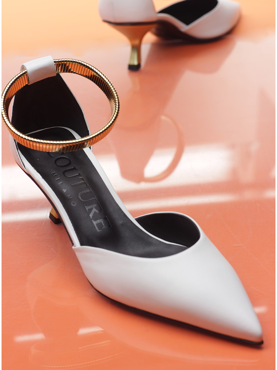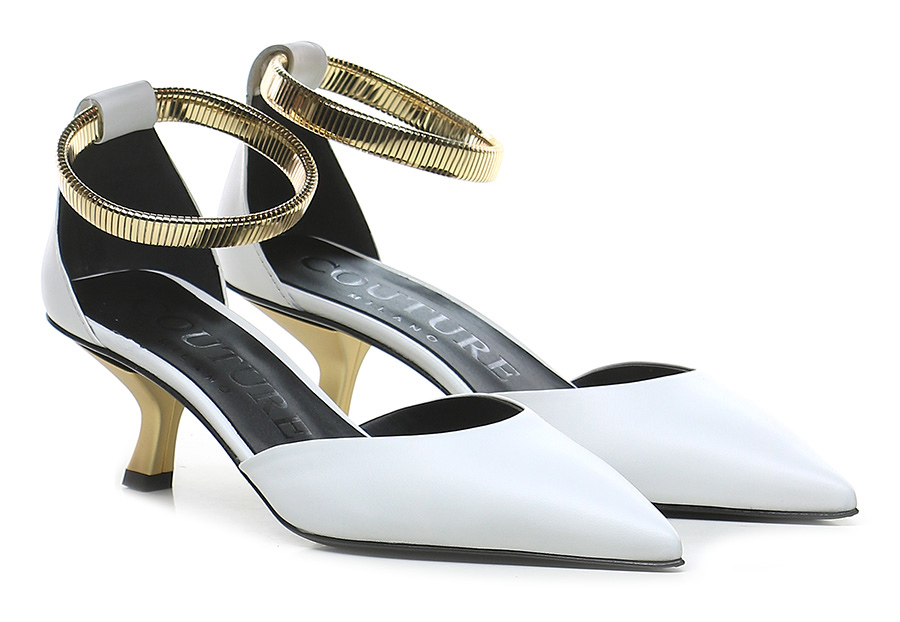 Scarpa in pelle con cinturino alla caviglia e accessorio metallico gold removibile. Suola in cuoio. Altezza tacco 60mm. Tacco in pvc effetto opaco.