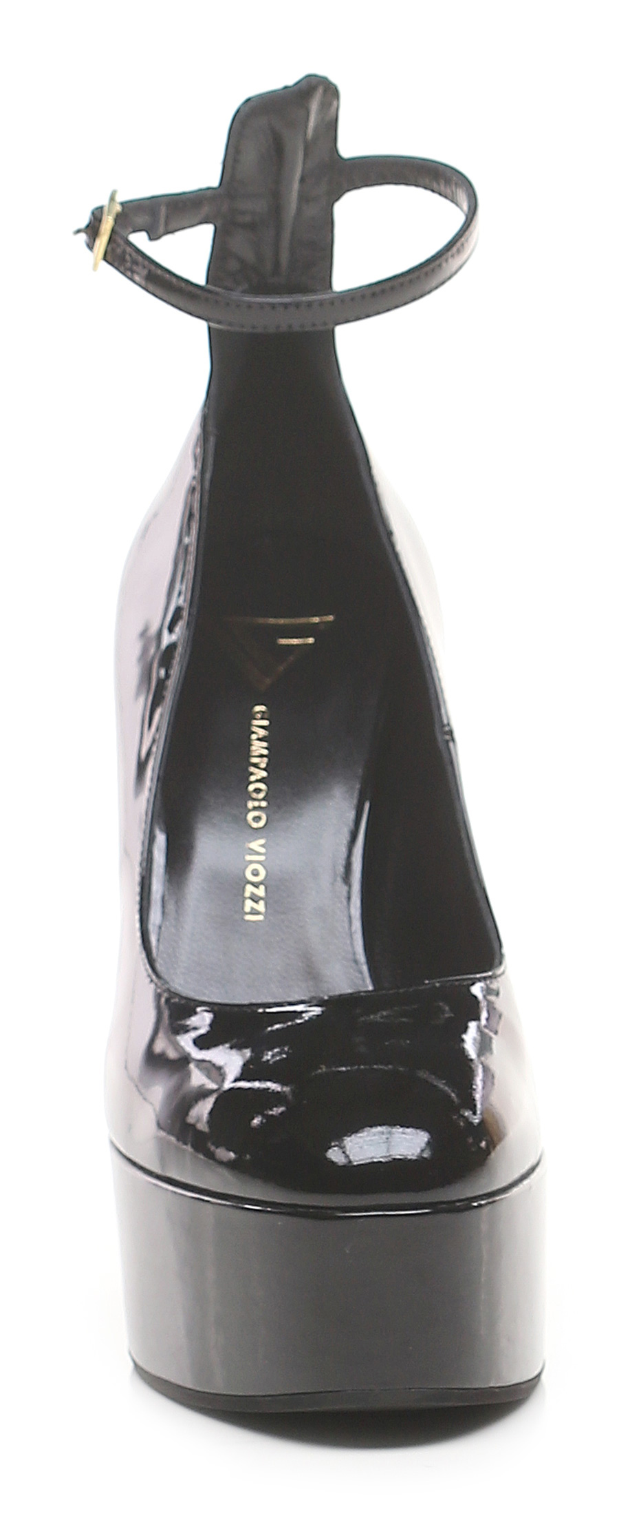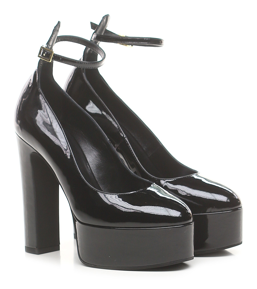 Scarpa in vernice con cinturino alla caviglia e suola in gomma. Altezza tacco 130mm, platform 40mm con battuta 90mm.