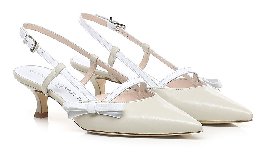 Scarpa in pelle con cinturino sul retro e suola in cuoio. Altezza tacco 50mm.