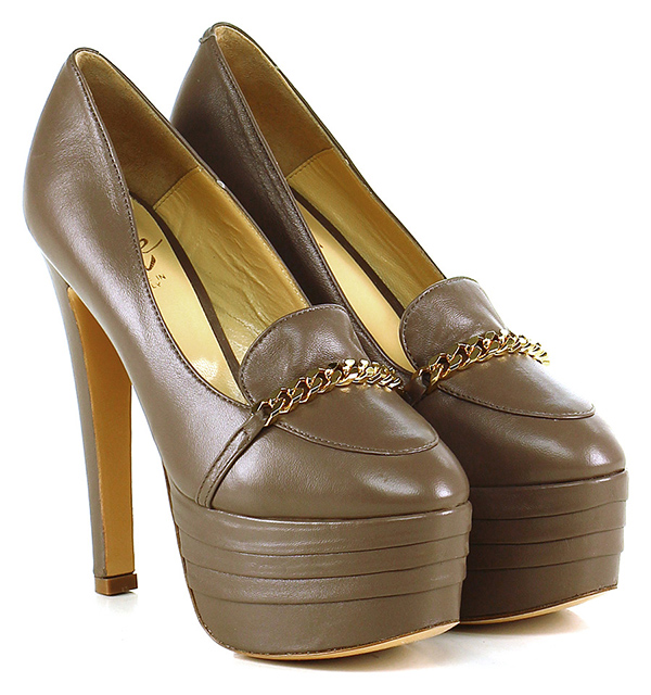 Scarpa con tacco in pelle con catena gold frontale. Suola in cuoio, tacco 150, platform 50 con battuta 100.