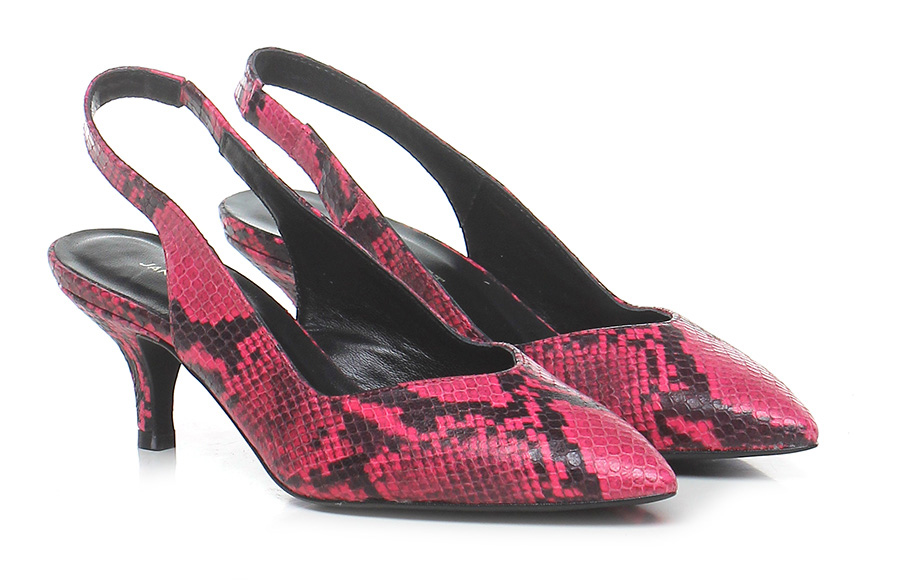 Scarpa con tacco in pelle stampa pitone con cinturino elastico sul retro, suola in gomma. Tacco 65.