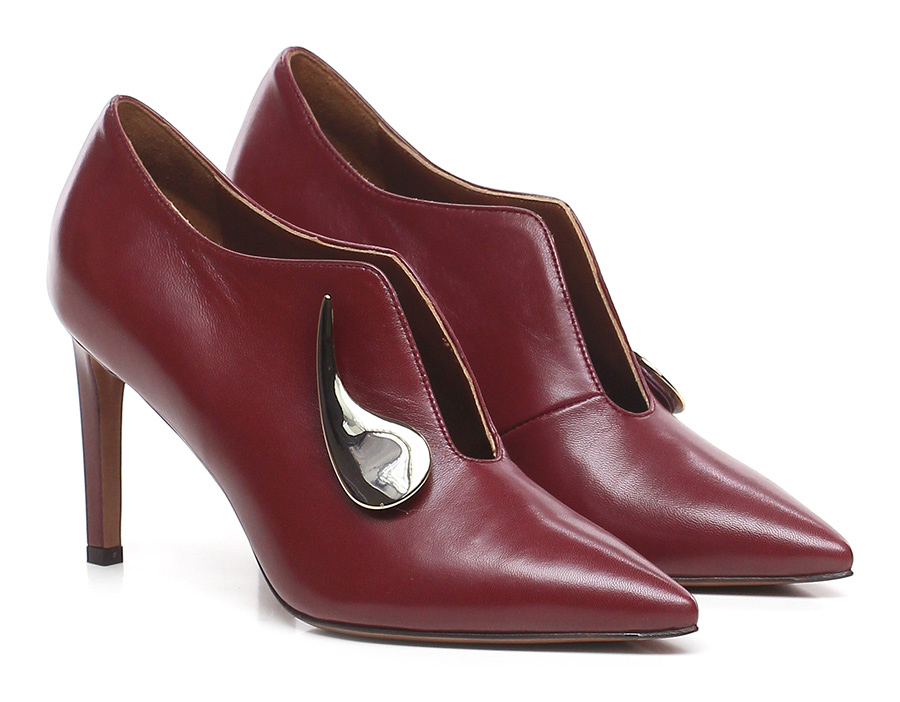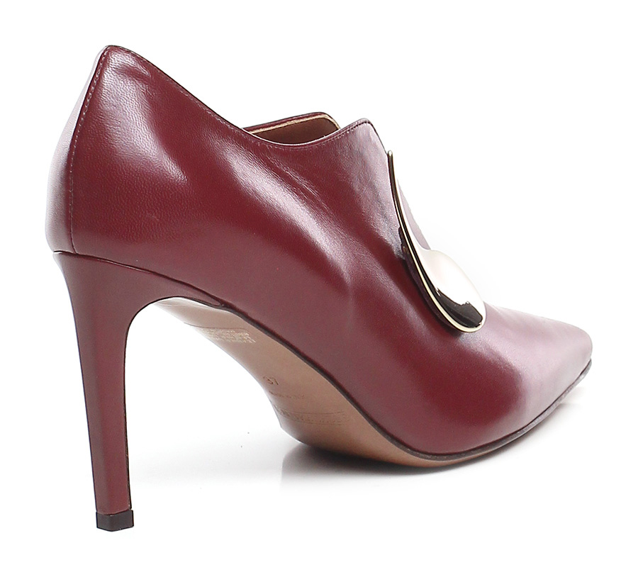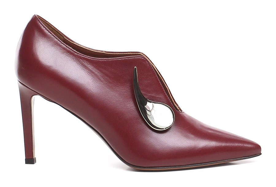 Scarpa con tacco in pelle con applicazioni effetto metallico lato esterno, suola in cuoio e gomma. Tacco 90.