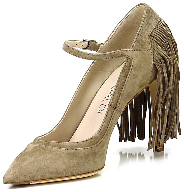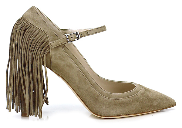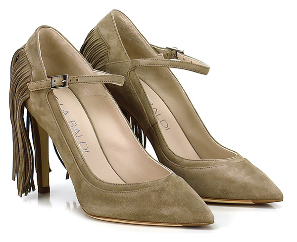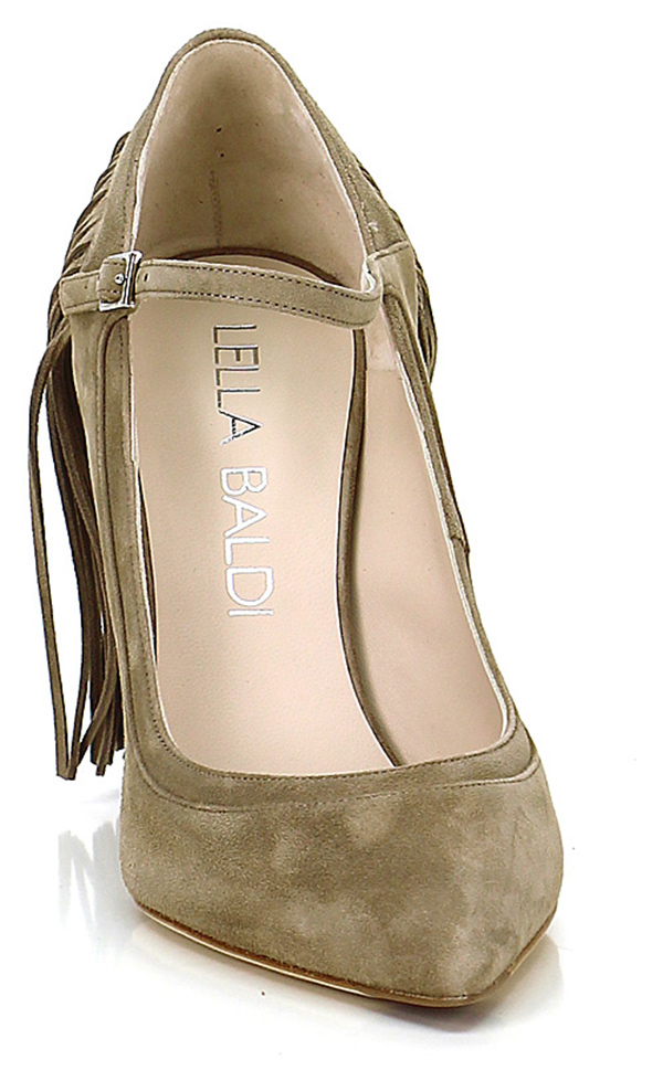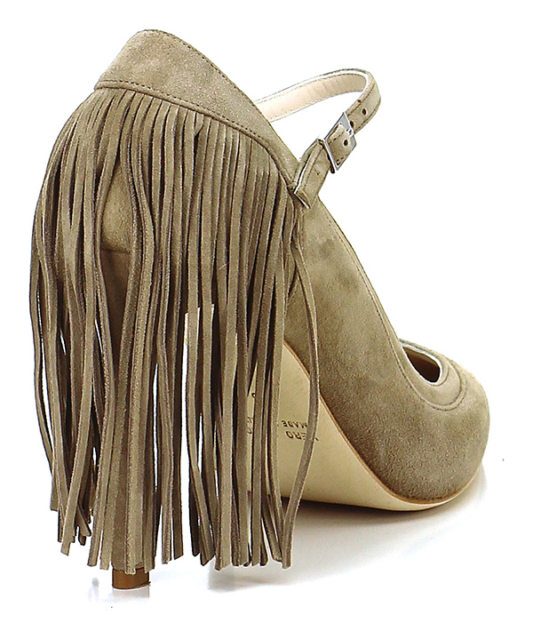 Scarpa con tacco in camoscio con cinturino su collo piede e frange su retro. Suola in cuoio e gomma, tacco 95.