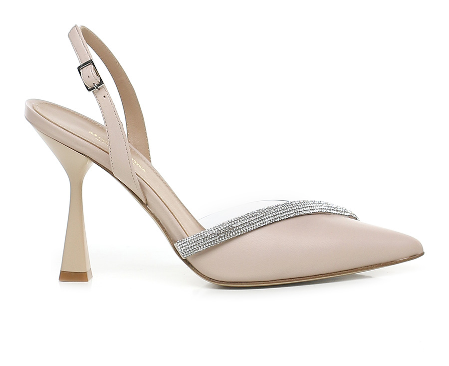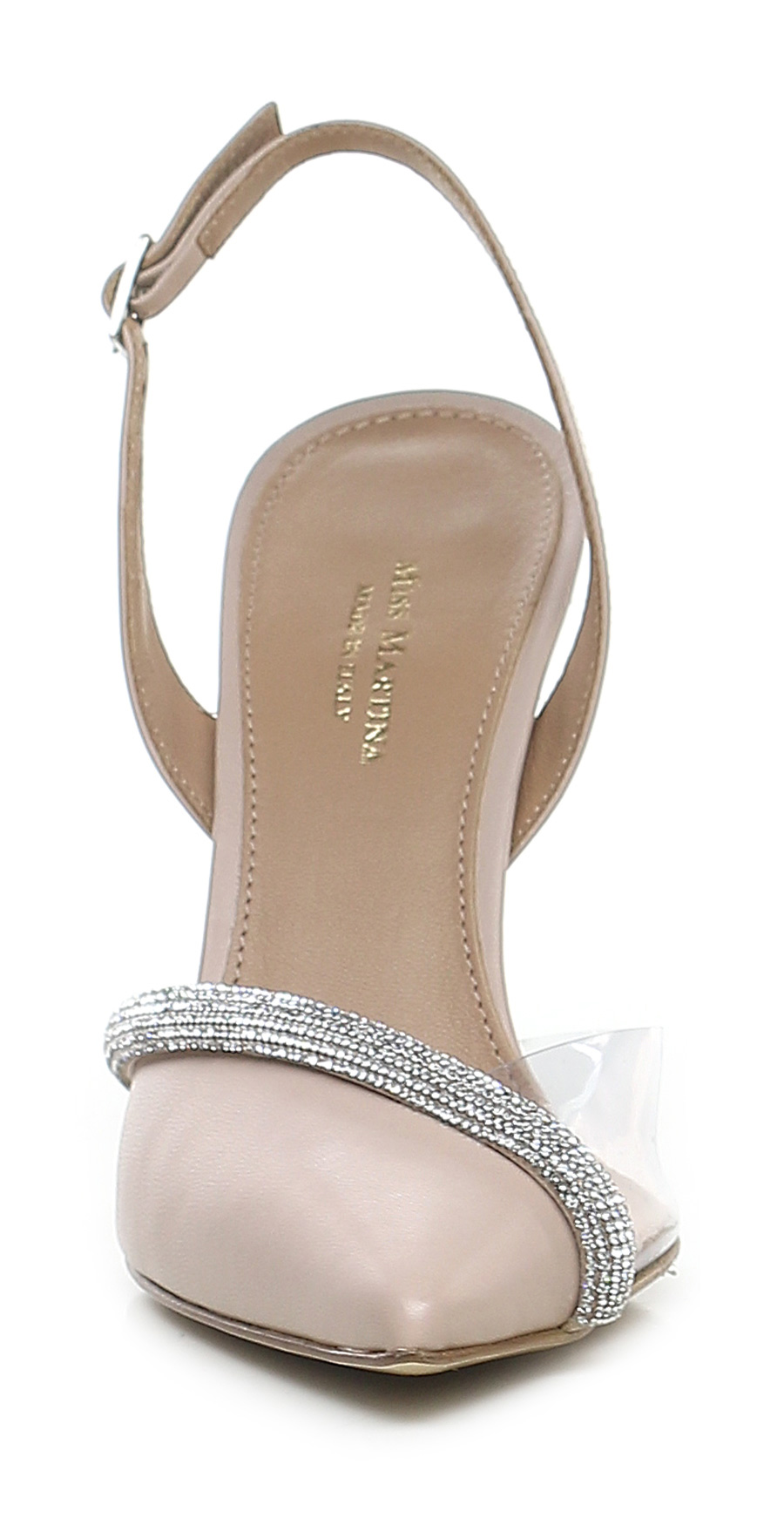 Scarpa in pelle e pvc con cinturino retro e applicazione di strass frontali. Suola in cuoio: altezza tacco 105mm. Tacco a rocchetto in pvc.