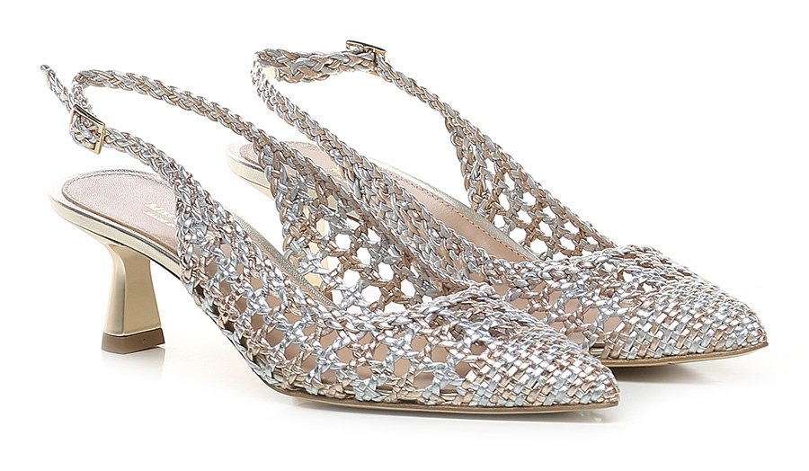 Scarpa in pelle laminata intrecciata con cinturino sul retro. Suola in cuoio. Altezza tacco 60mm.