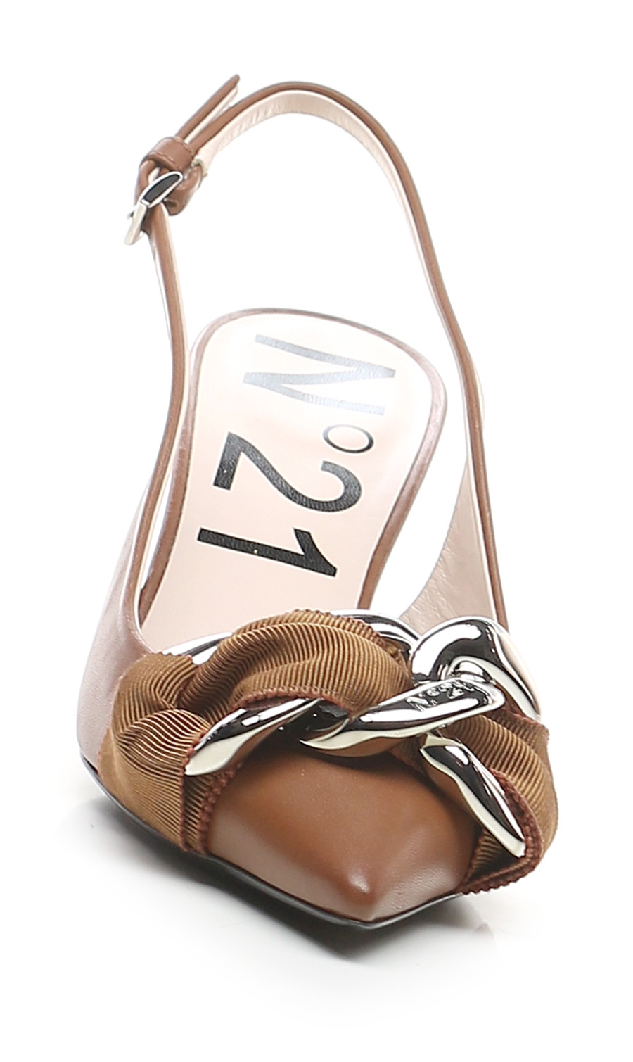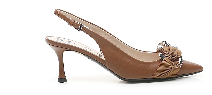 Scarpa in pelle con cinturino sul retro ed inserto in tessuto e accessorio catena frontale. Suola in cuoio. Altezza tacco 75mm.