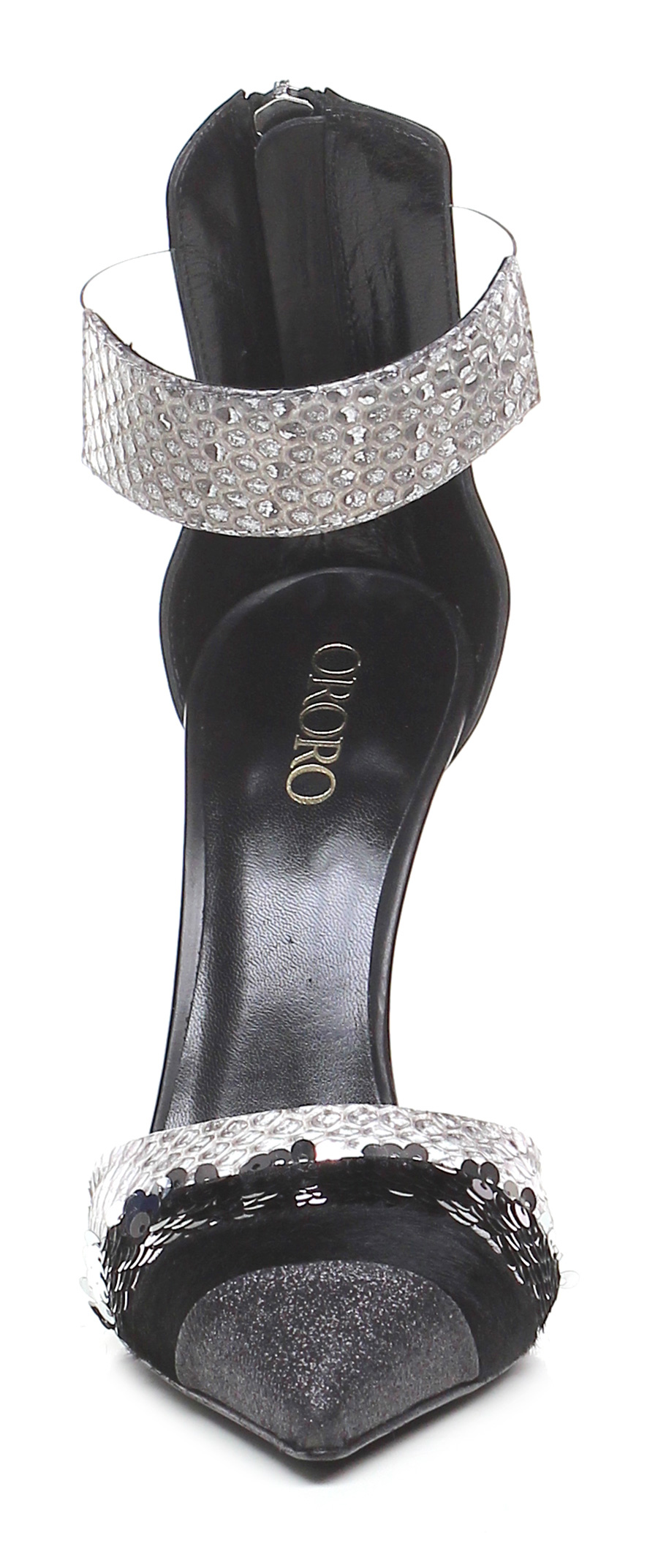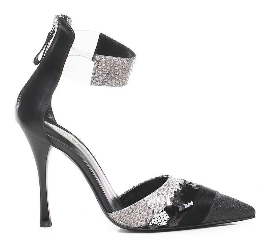 Scarpa con tacco in pelle stampa pitone, cavallino, sequins e pvc trasparente con cinturino alla caviglia e zip sul retro. Suola in cuoio. Tacco 110.