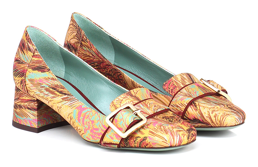 Scarpa con tacco in tessuto stampato con cinturino frontale e suola in cuoio. Tacco 50.