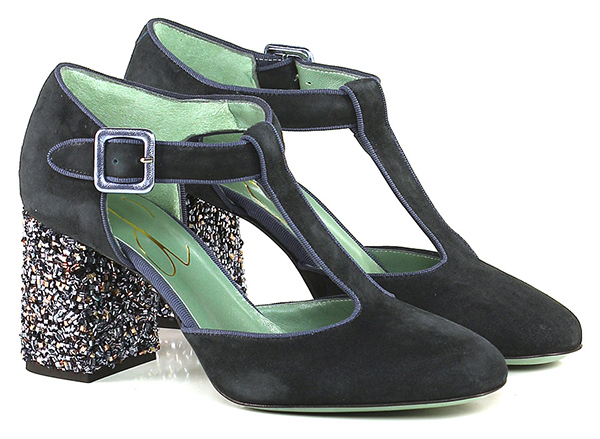Scarpa con tacco in camoscio con cinturino alla caviglia e suola in cuoio. Tacco 75 con multi pietre.