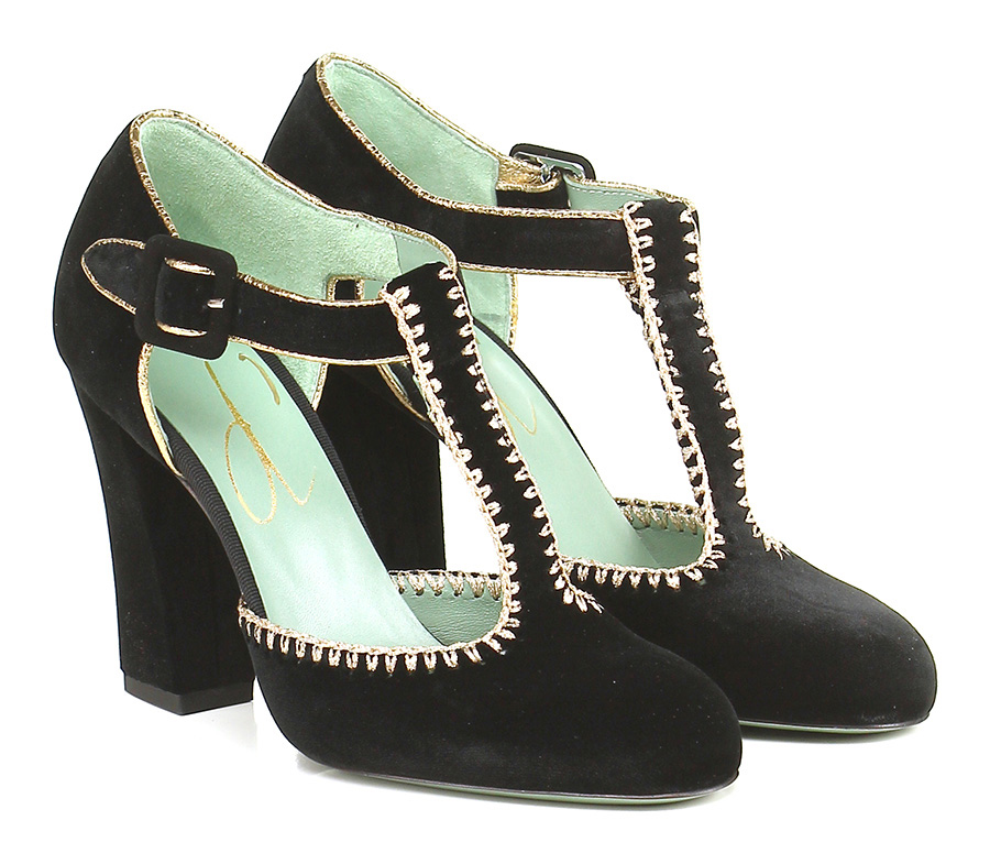 Scarpa con tacco in velluto con ricami in crochet cinturino alla caviglia e suola in cuoio. Tacco 95.