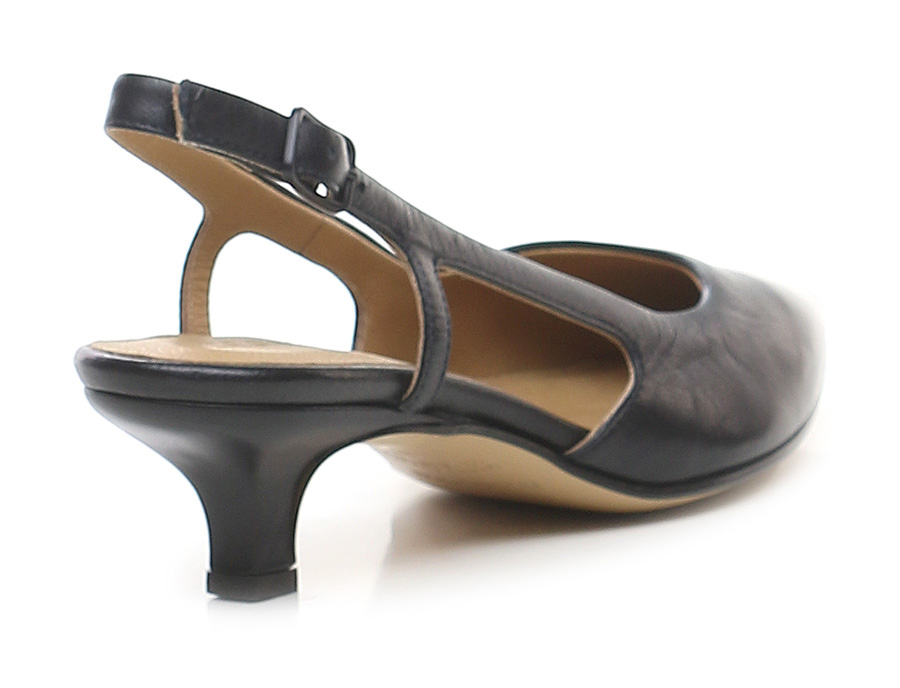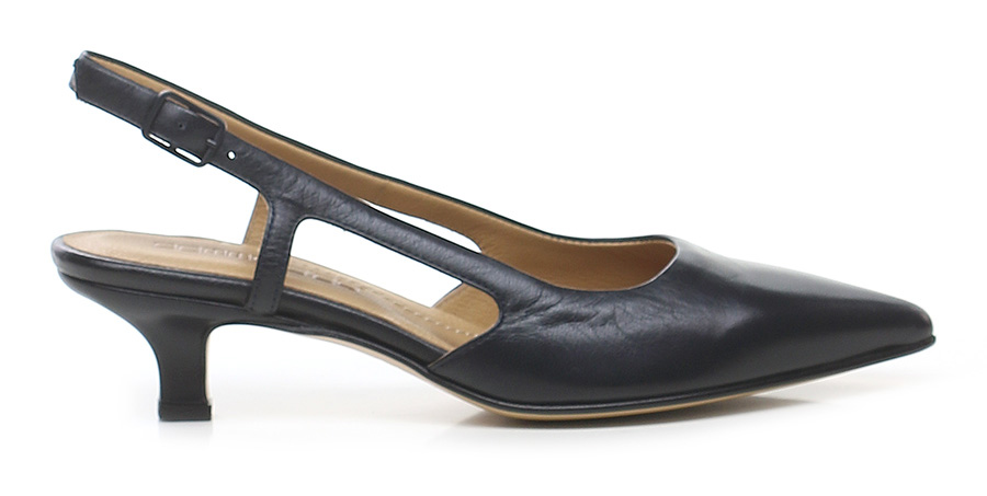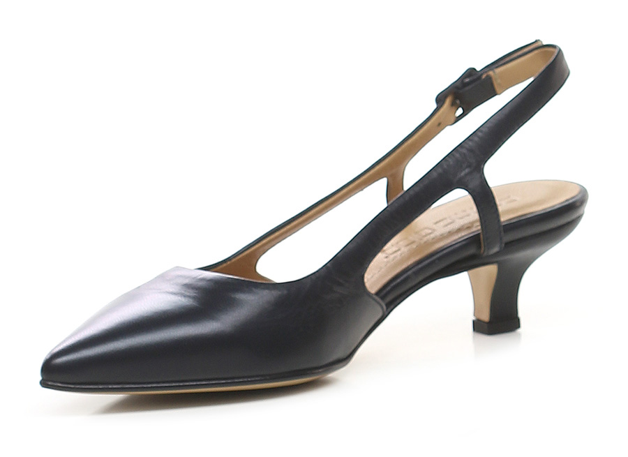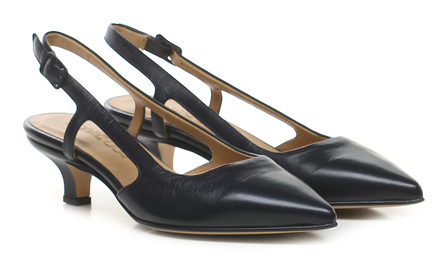 Scarpa in pelle con cinturino retro e suola in cuoio e gomma. Altezza tacco 55mm
