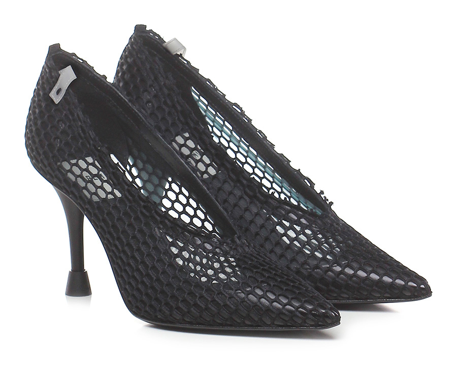 Scarpa con tacco in tessuto a rete con inserti in pelle, suola in cuoio e gomma. Tacco 95.