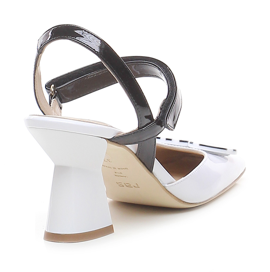 Scarpa con tacco in vernice con cinturino al collo del piede a chiusura strappo. Suola in cuoio. Tacco 85. Accessorio frontale in metacrilato.