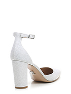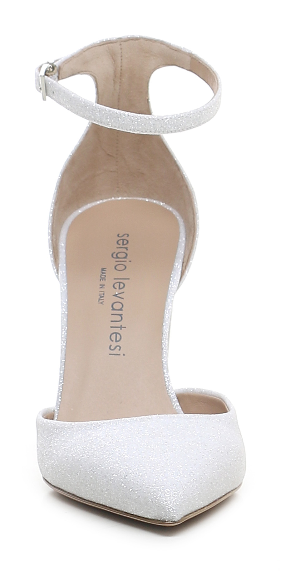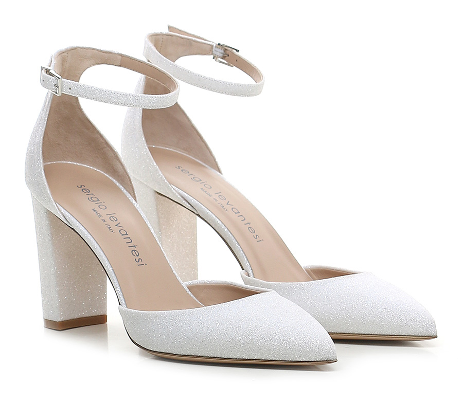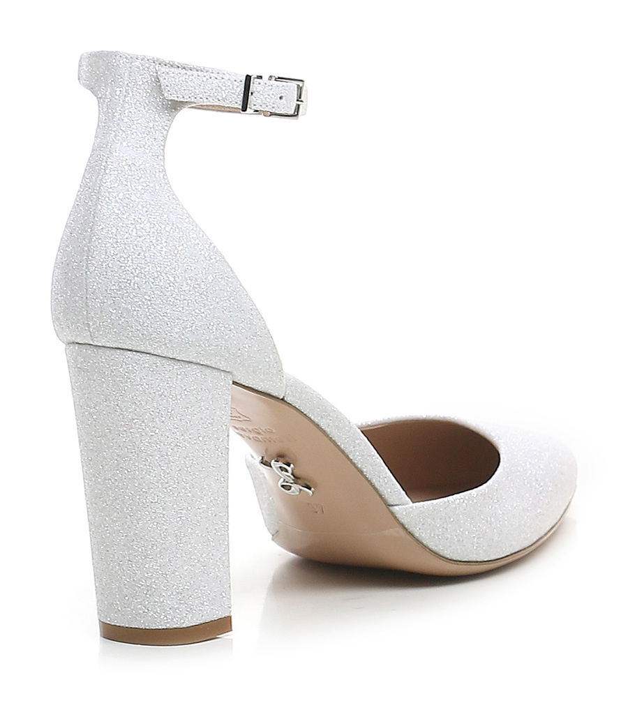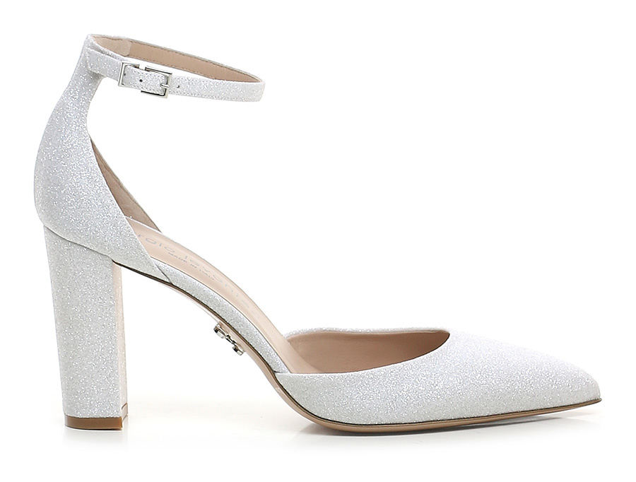 Scarpa in glitter con cinturino alla caviglia. Suola in cuoio. Altezza tacco 100mm.