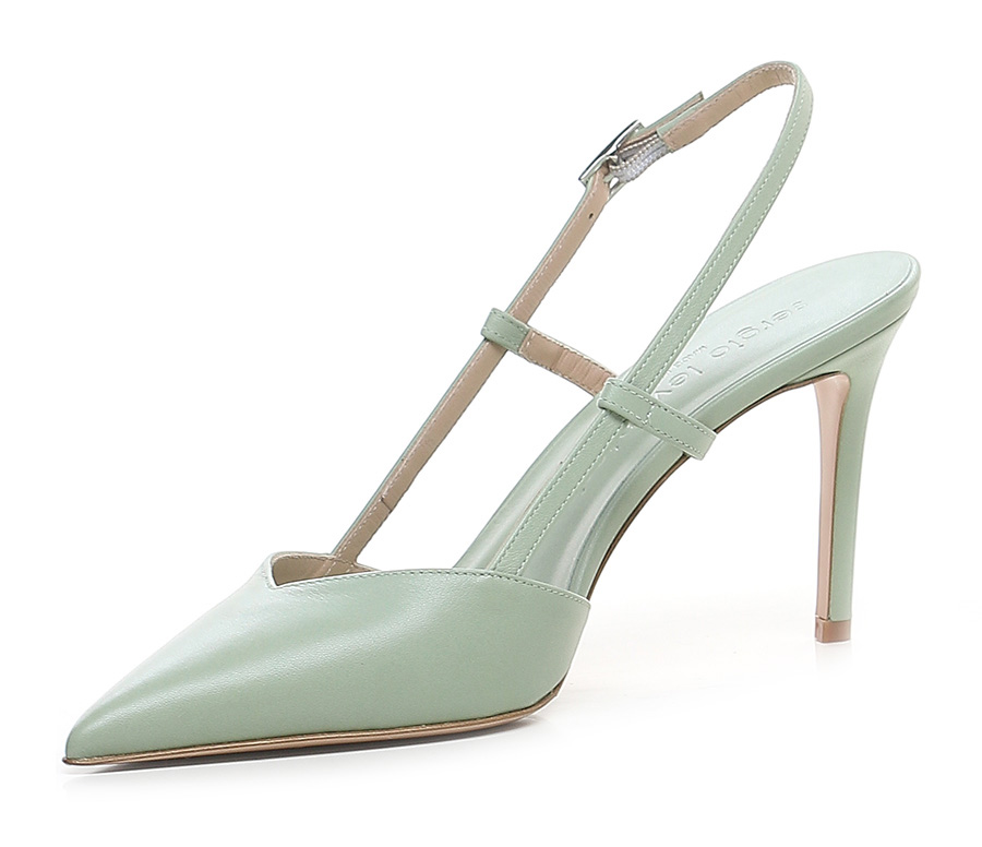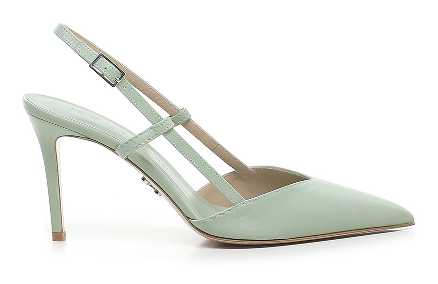 Scarpa con tacco in nappa, cinturino sul retro con fibbia, suola in cuoio. Tacco 85.