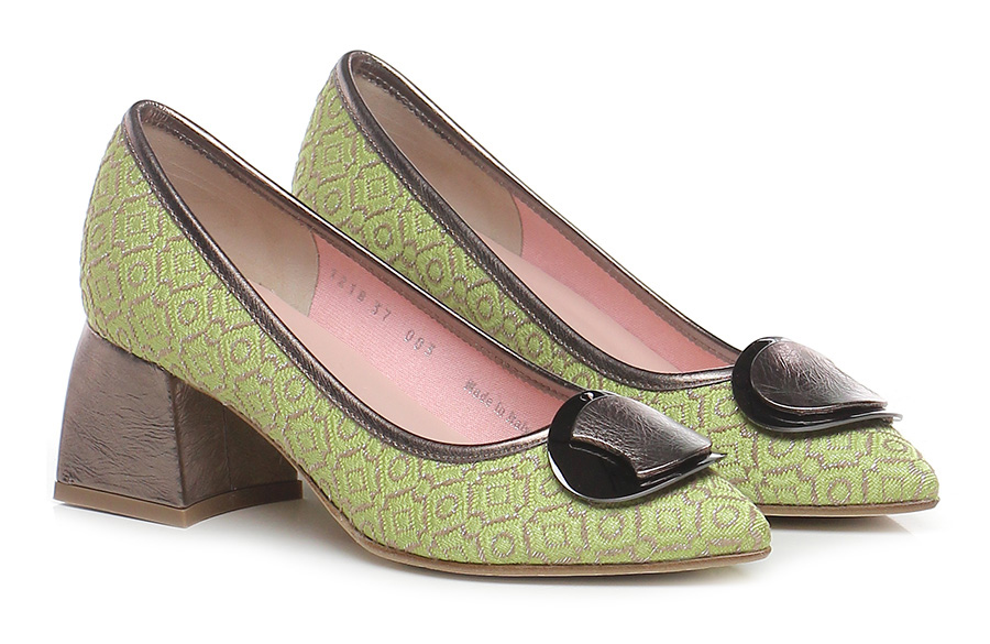 Scarpe bassa in tessuto e pelle laminata con applicazione frontale, suola in cuoio e gomma. Tacco 60, rivestito in pelle laminata.
