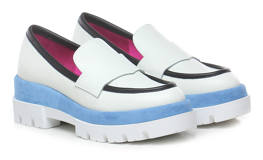 Scarpe basse in pelle martellata con inserti in camoscio, suola in gomma over size. Tacco 55, platform 35 con battuta 20.