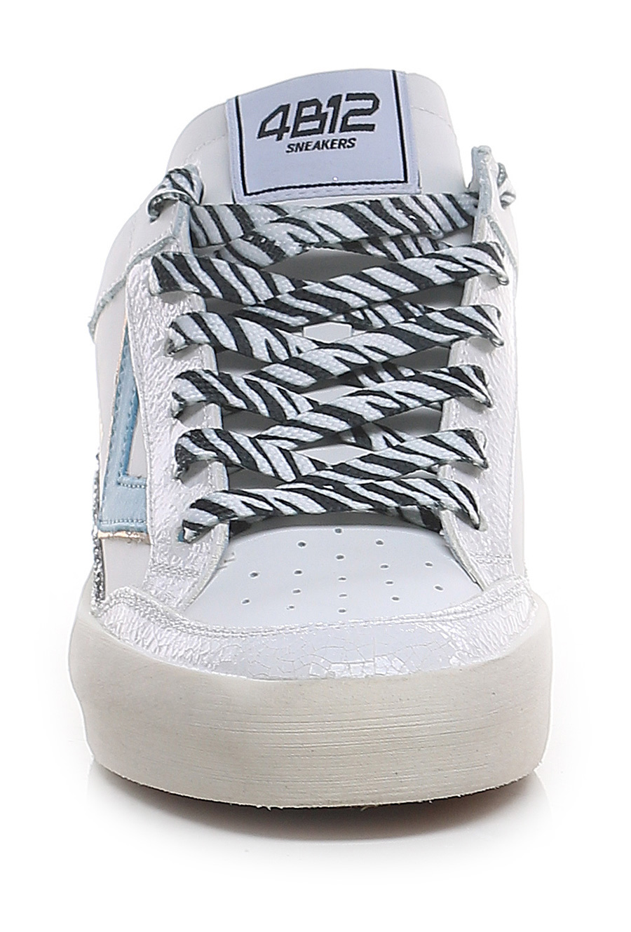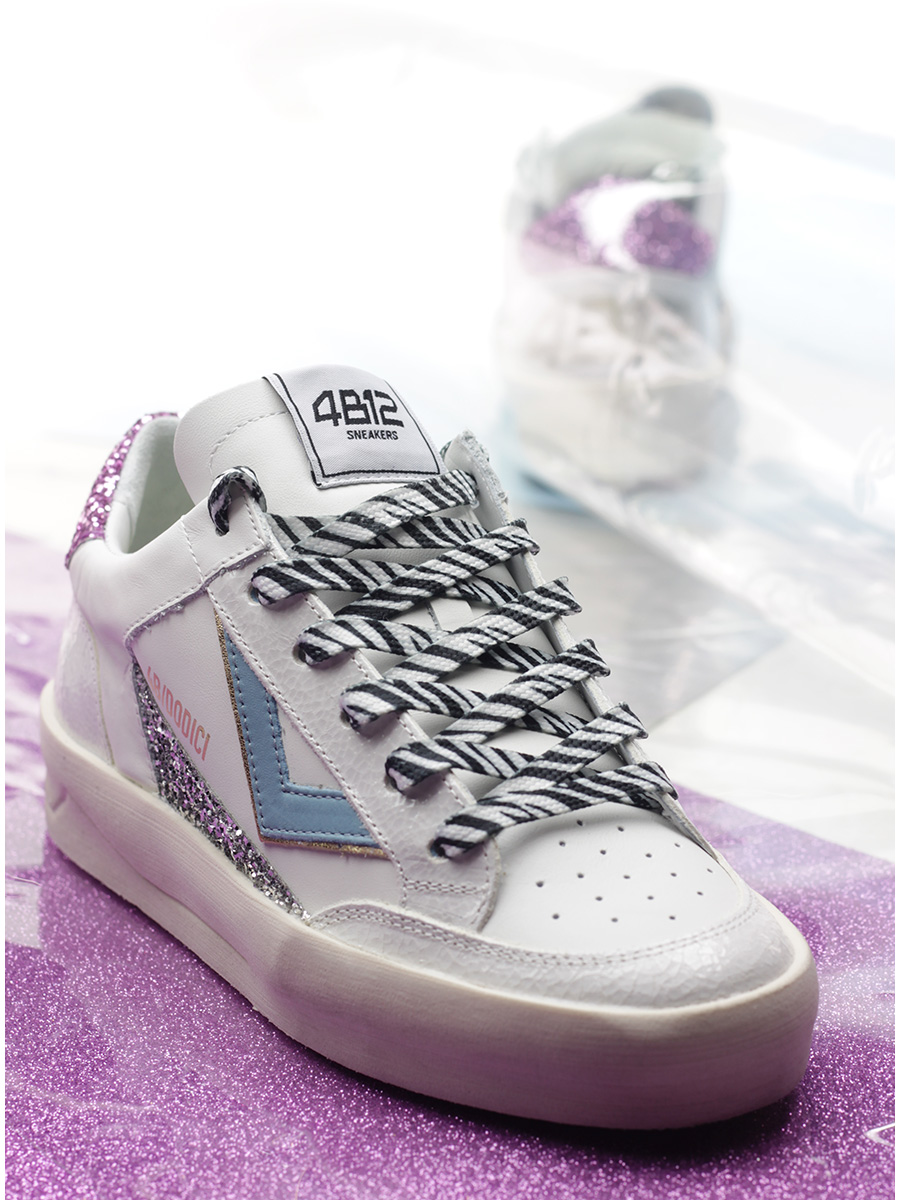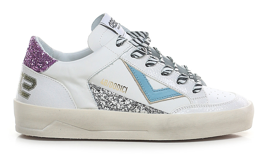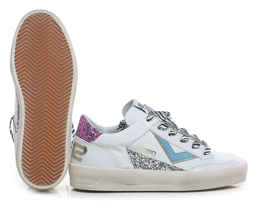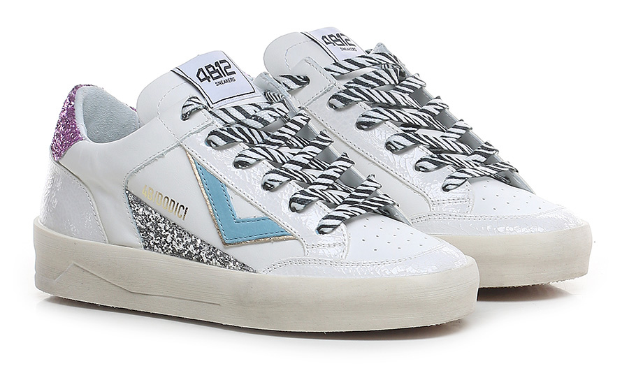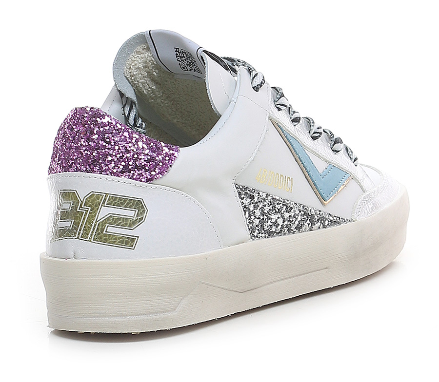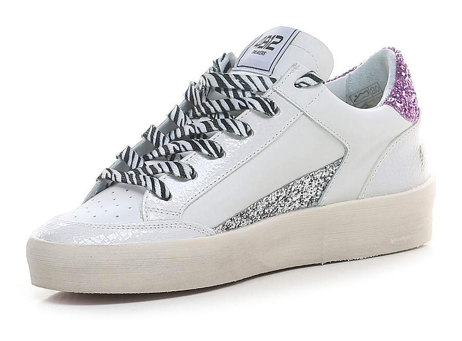 Sneaker in pelle e pelle effetto crack con inserti in glitter. Suola in gomma effetto vintage. Altezza tacco 35mm, platform 30mm con battuta di 5mm.