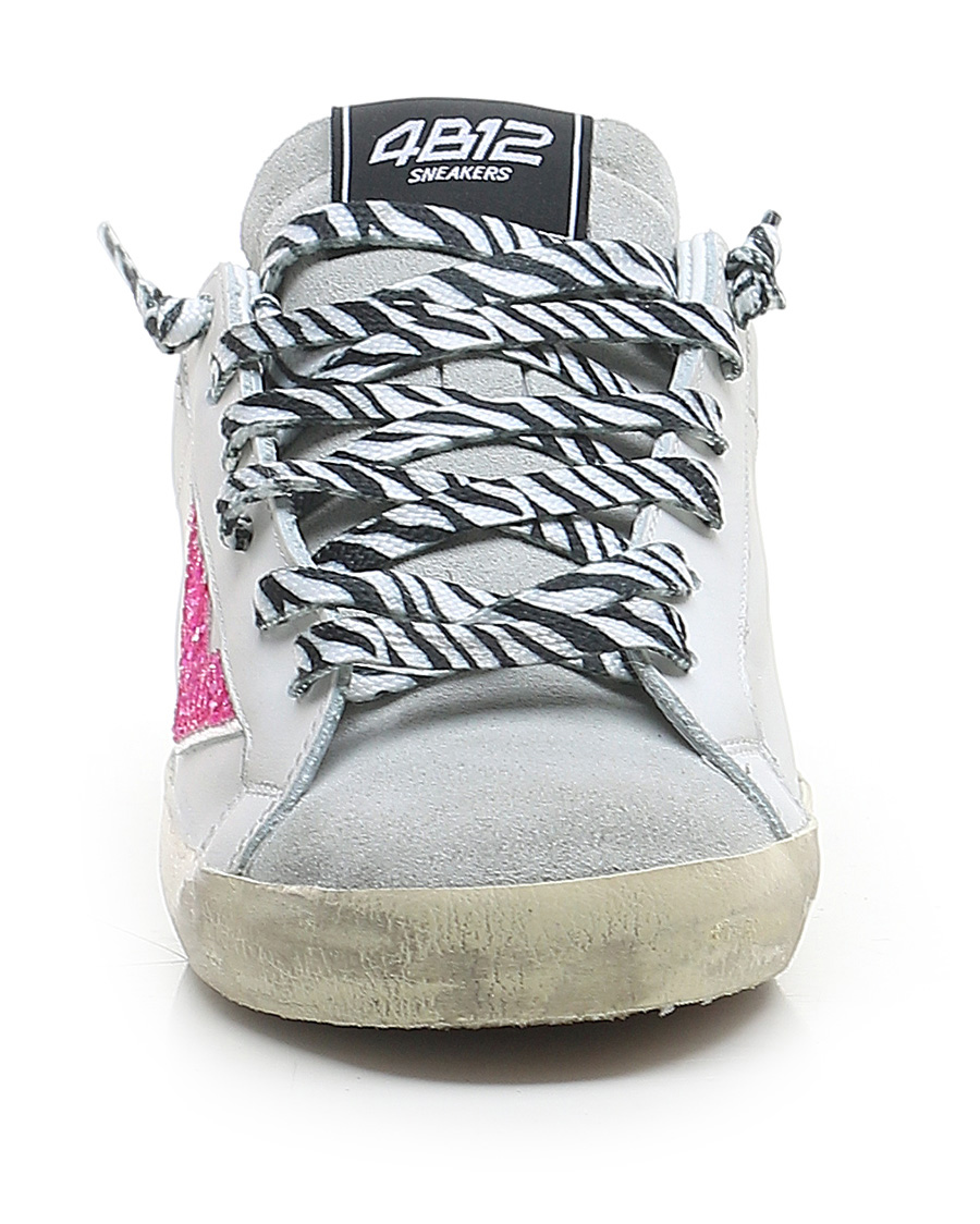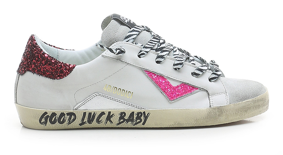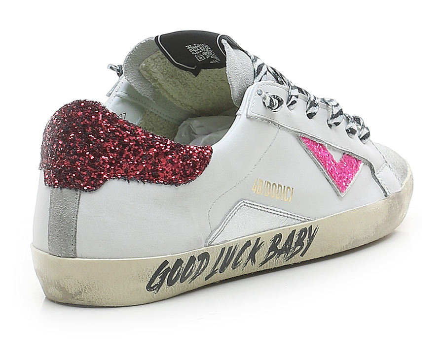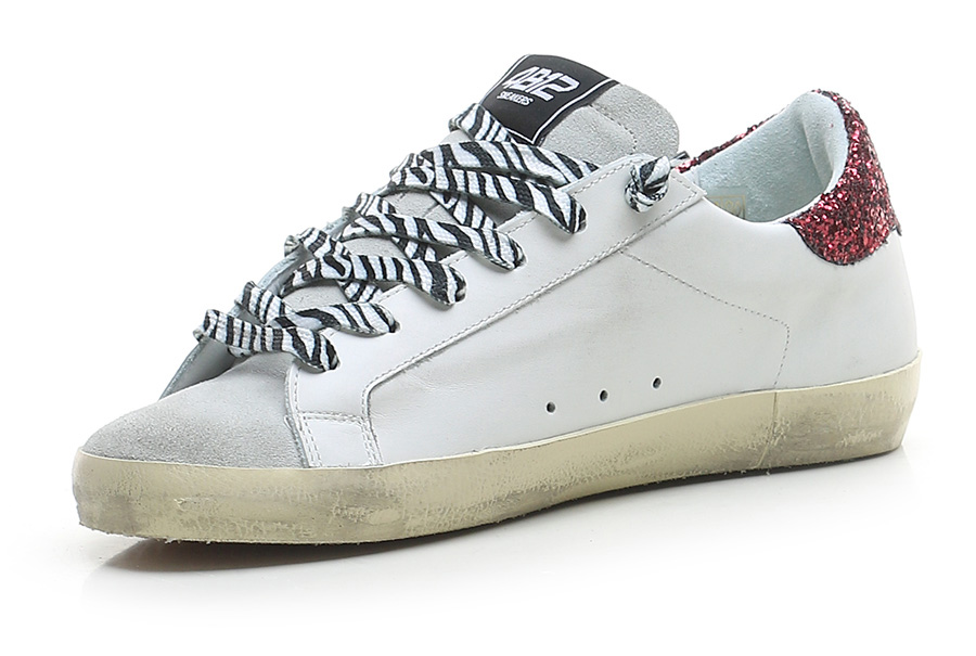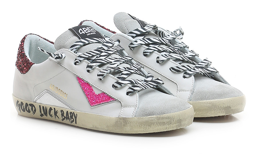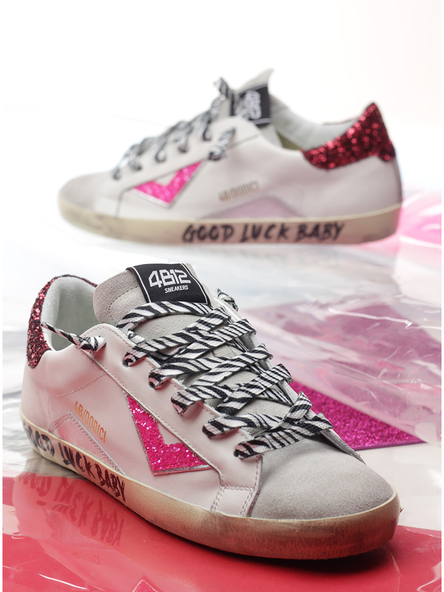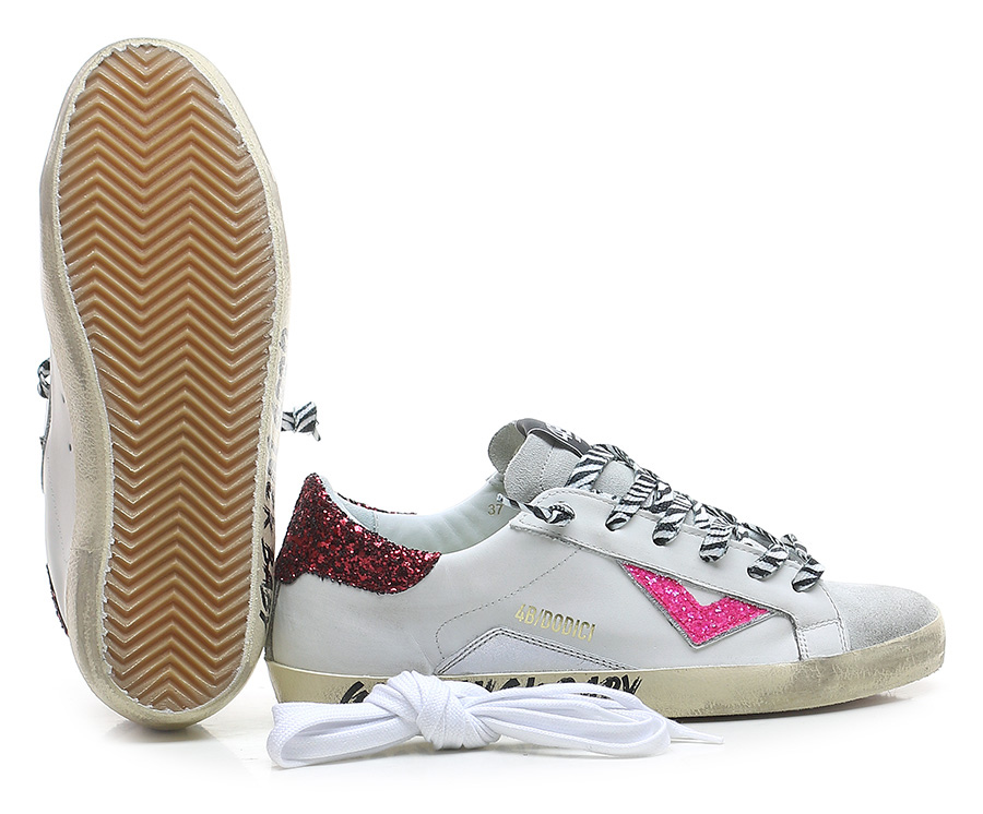 Sneaker in pelle effetto vintage e camoscio effetto vintage con inserti in glitter. Suola in gomma effetto vintage. Altezza tacco 25mm, platform 20mm con battuta di 5mm.