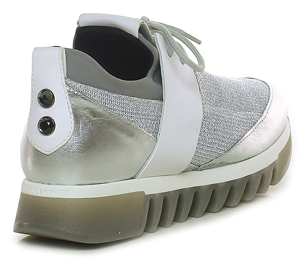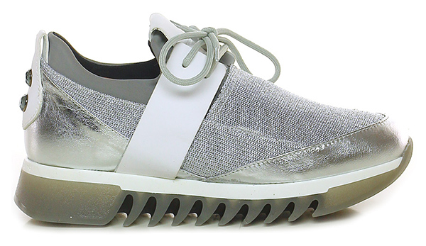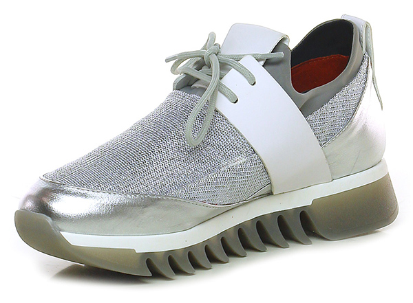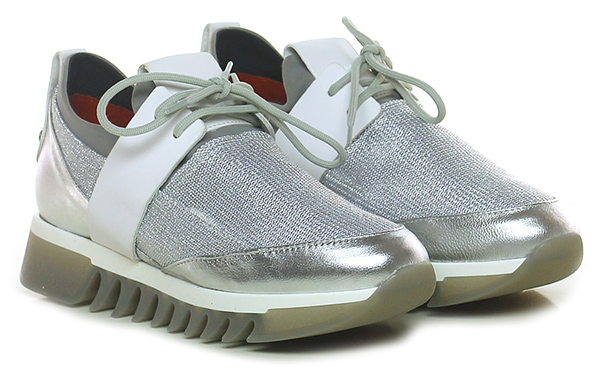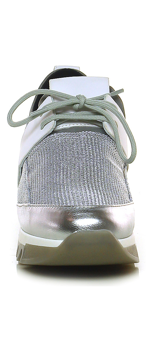 Sneaker in pelle laminata, pelle e tessuto laminato con strass su retro e tomaia elasticizzata alla caviglia. Suola in gomma, tacco 40, platform 30 con battuta 10.