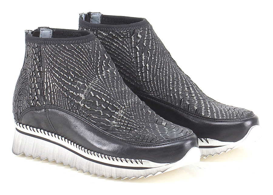 Sneaker in pelle e pelle effetto laminata con zip su retro e suola in gomma light. Tacco 45, platform 25 con battuta 20.