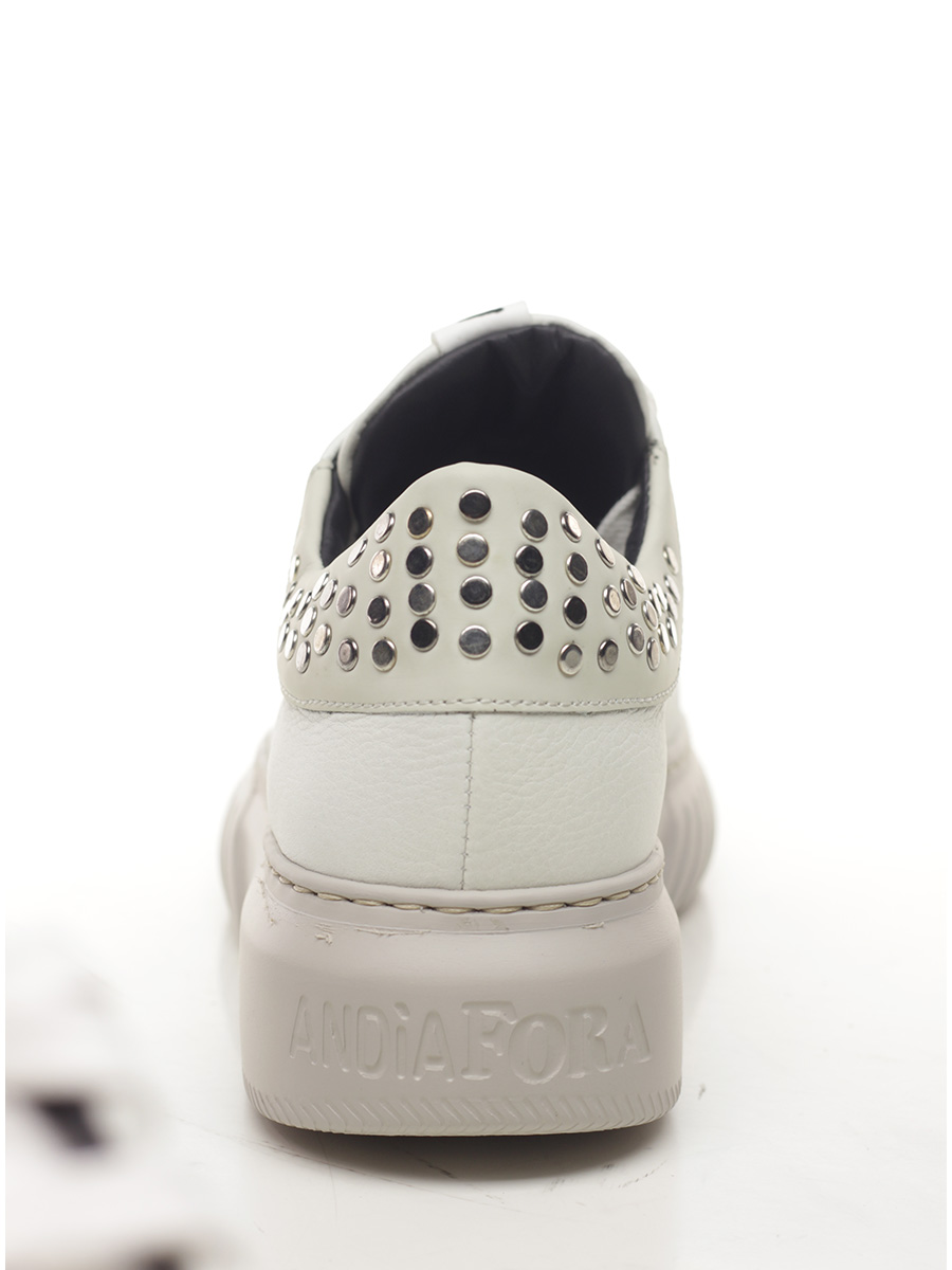 Sneacker in pelle con borchie sul talloncino. Suola in gomma, altezza tacco 40mm, plattform 30mm con battuta di 10mm.